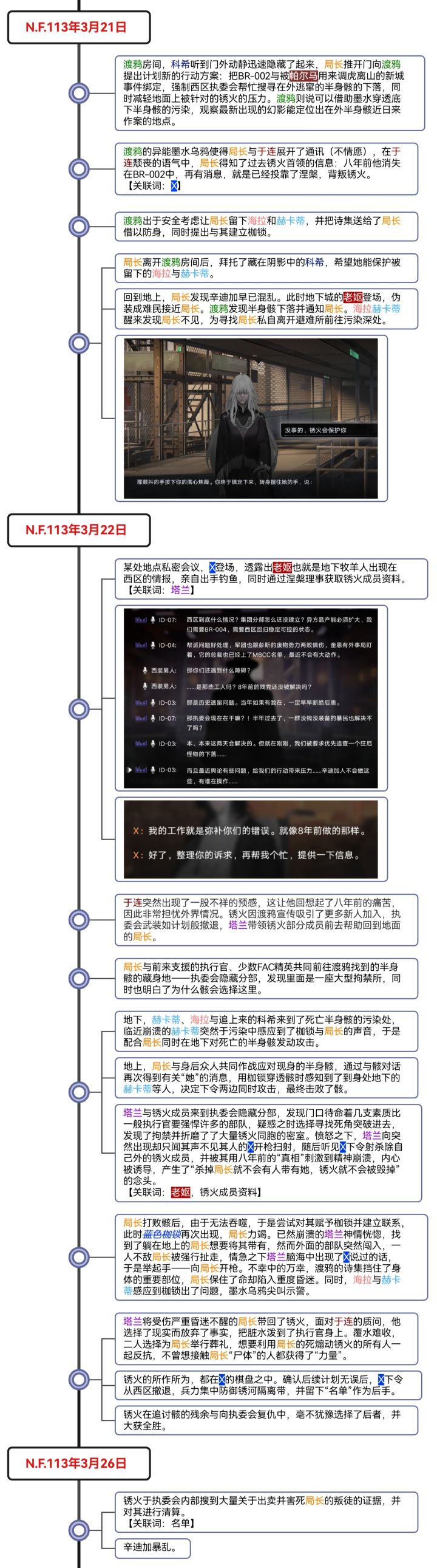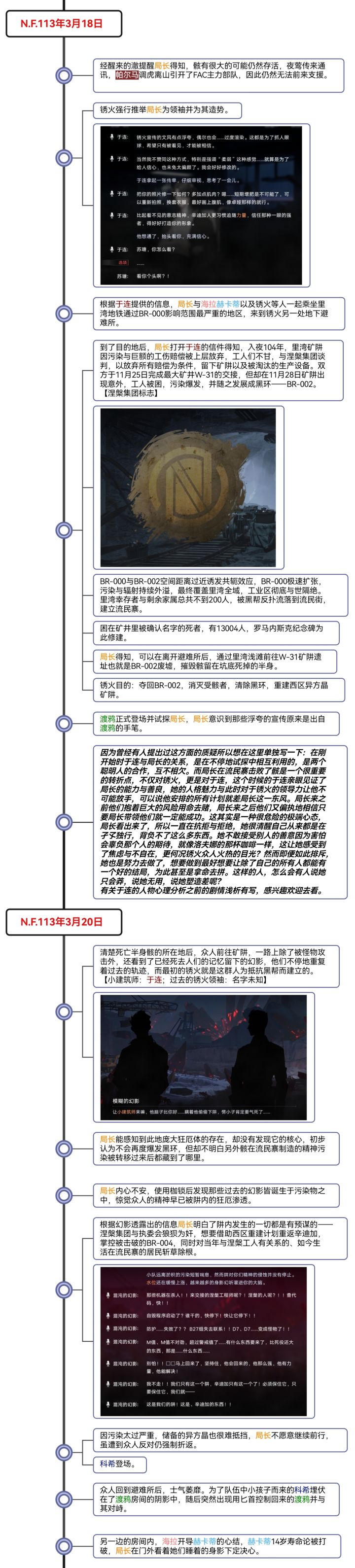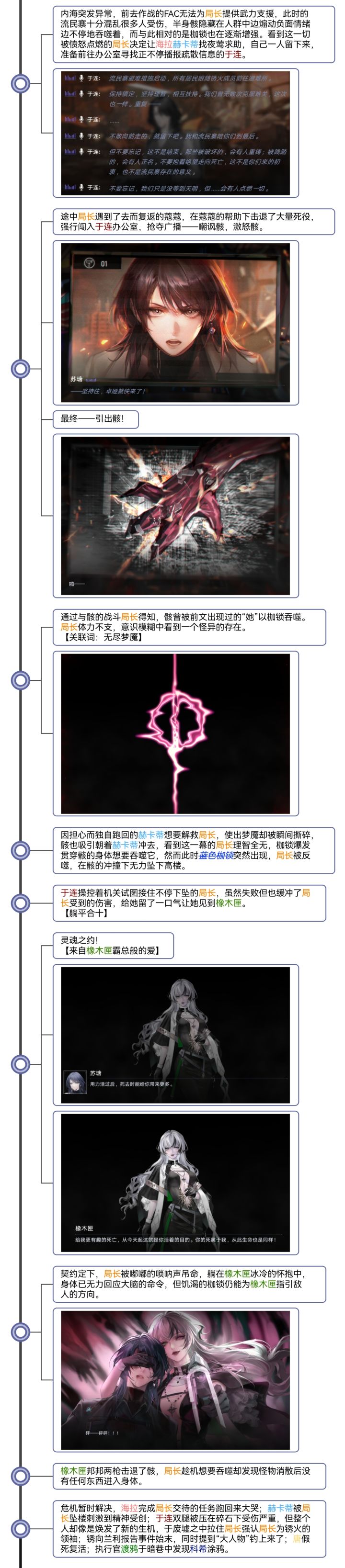 是这样的,上一篇的剧情梳理因为自身时间原因,写完就直接发了出去没有检查,经人提醒有错字漏字后,第二天回看了一下,发现甚至很多语句也不通顺,可以说是越看越看毛病越多,越看越不顺眼。 最开始总结的时候只想着把内容提炼简述出来就好了,于是一个又一个的角色行为被干瘪地列了出来,完全忽视了事件发展的整体性与人物感情的变化衔接,且主视角与地点的切换毫无预兆,给人一种东一榔头、西一棒槌的感觉,这些问题最终导致