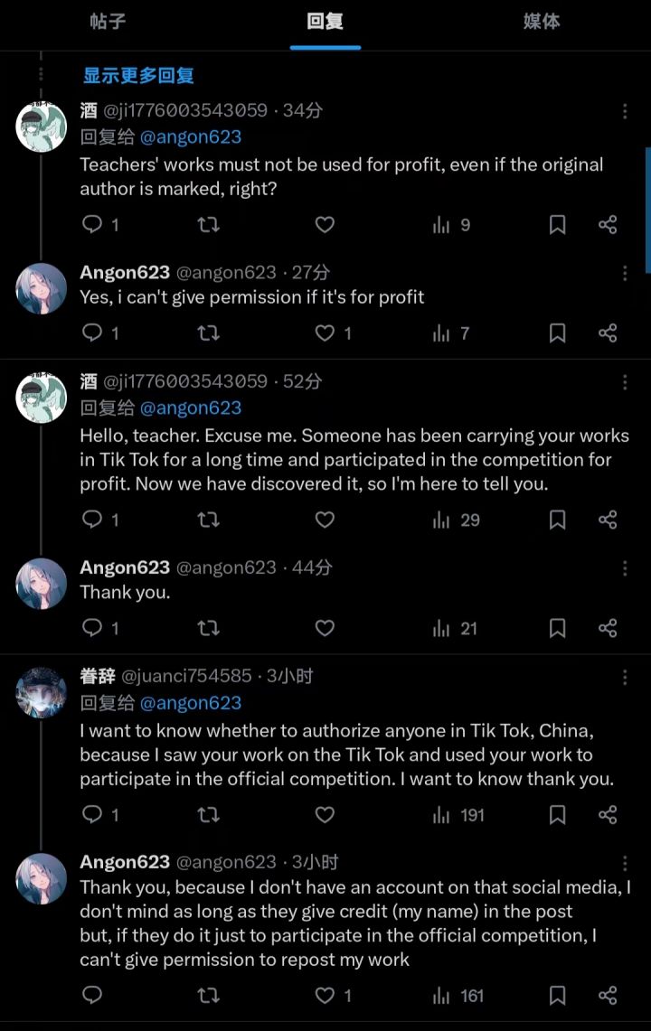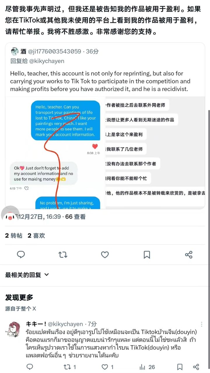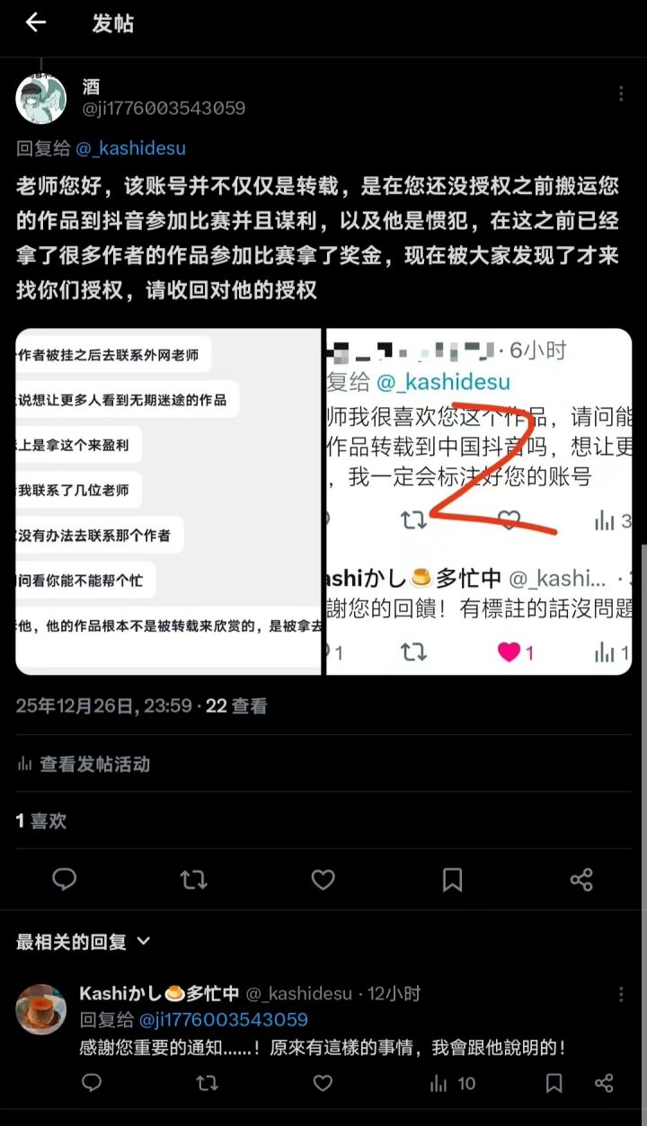 抖音知名2.6万博主“♱”长期靠搬用外网老师作品参加抖音举办的无期迷途创作者激励计划牟利,被其他老师发现后仍然不知悔改直至今日还在盗用外网老师作品参赛。以上图片是我们向原创作者告知事实真相老师们的声明,目前该盗用作品博主依旧嚣张在我们联系了抖音平台的各位主播进行制作证据链视频后对面举报我们暴露她的聊天记录,并开直播嘲讽。麻烦各位刷到的老师去该平台举报一下抖音博主“♱”,请尊重原创作者!(现已有一位