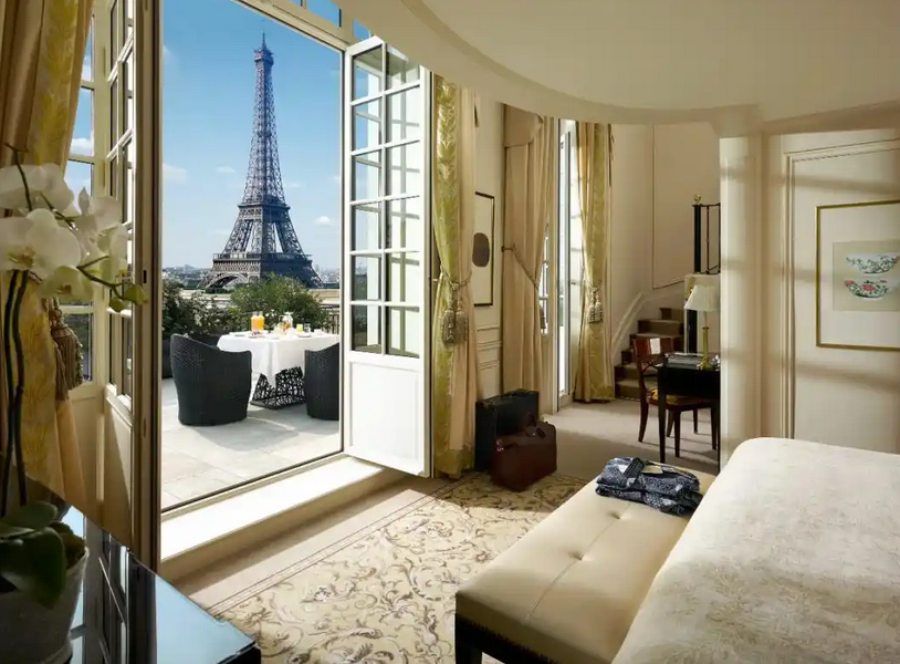 找的时候胆战心惊,生怕不小心点到哪然后对面以为我住得起给我打广告电话。是巴黎香格里拉大酒店(Shangri-LaHotelParis)的居斯塔夫·埃菲尔套房 · La Suite Gustave Eiffel(p2).找了好几间,不是窗户对不上就是窗户外面的围栏花纹对不上。(p3巴黎雅典娜酒店Hotel Plaza Athenee,Paris的埃菲尔套房 · Eiffel Suite)(p4是