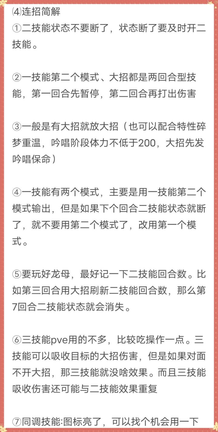哈喽,小伙伴们大家好,我是无烬。今天给大家带来一期的攻略龙母的解析攻略。下面我们一起来看看吧!1.获取方式:辉石召唤,120辉石保底2.巅峰战斗力:141713.系别:龙4.类别:辉石宠·同调神宠5.特性:⑴系别特性:①加伤:猛兽猎手(龙)②回血:微创修复(龙)⑵能力特性:碎梦重温/玉龙雪饮(两个特性都刷,打boss时打不过就切另一个特性试试。或者去看攻略带的什么特性)6.装备