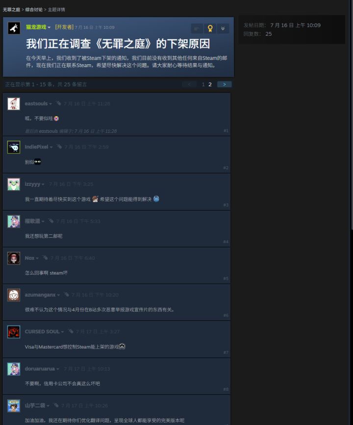 国产类《逆转裁判》风格的法庭推理文字AVG《无罪之庭》,近日突然在Steam平台下架,引起了大家的关注。开发商猫龙游戏表示已在7月16日上午收到Steam通知称游戏下架,但未获得进一步解释,目前正积极与平台沟通,调查具体原因。一度被怀疑是与Steam近期打击成人内容政策相关,甚至有玩家认为游戏“被误伤”。但据外媒PC Gamer报道,开发商已证实此次下架与DMCA(数字千年版权法案)投诉有关,即