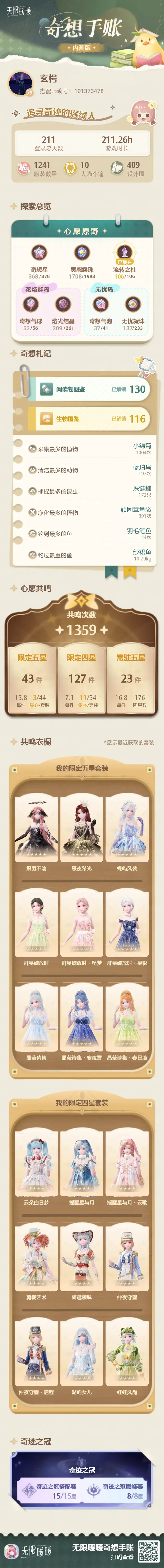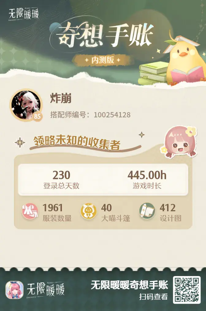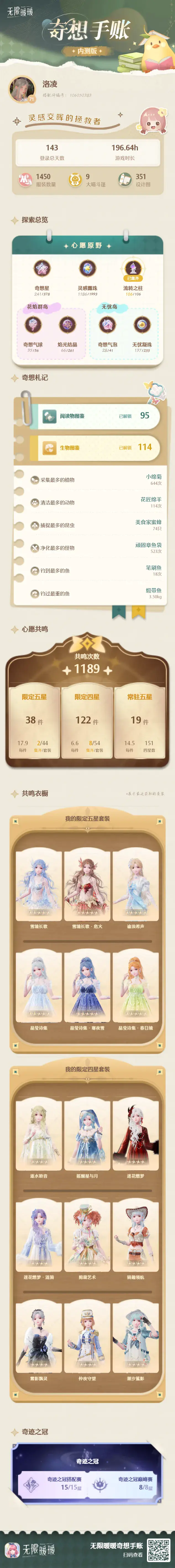 还有一个国际服的小号截不了图,差不多跟第三个号的时间开的,也得一百来个小时了,原来已经这么久了呀#无限暖暖 #无限暖暖奇想手账 #无限暖暖寻访趣味称号