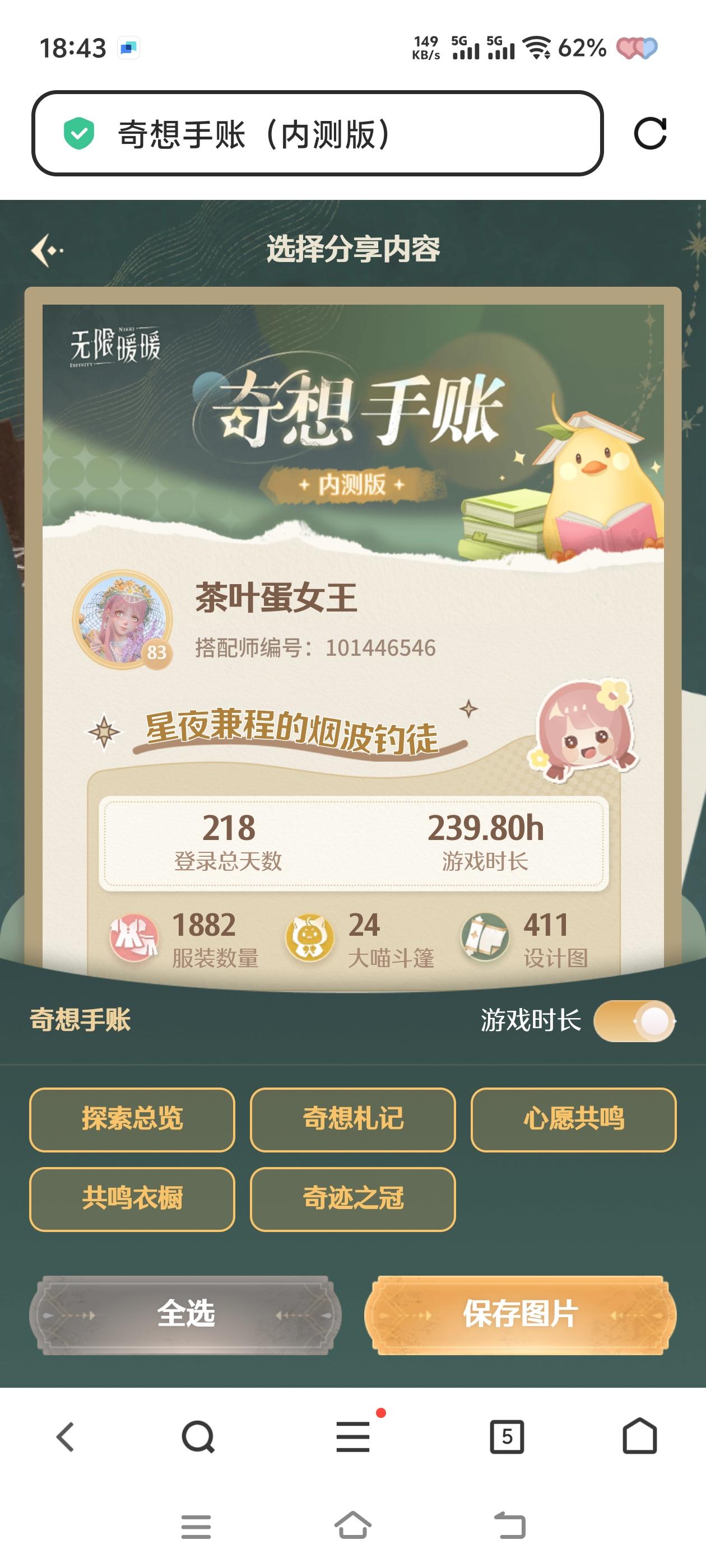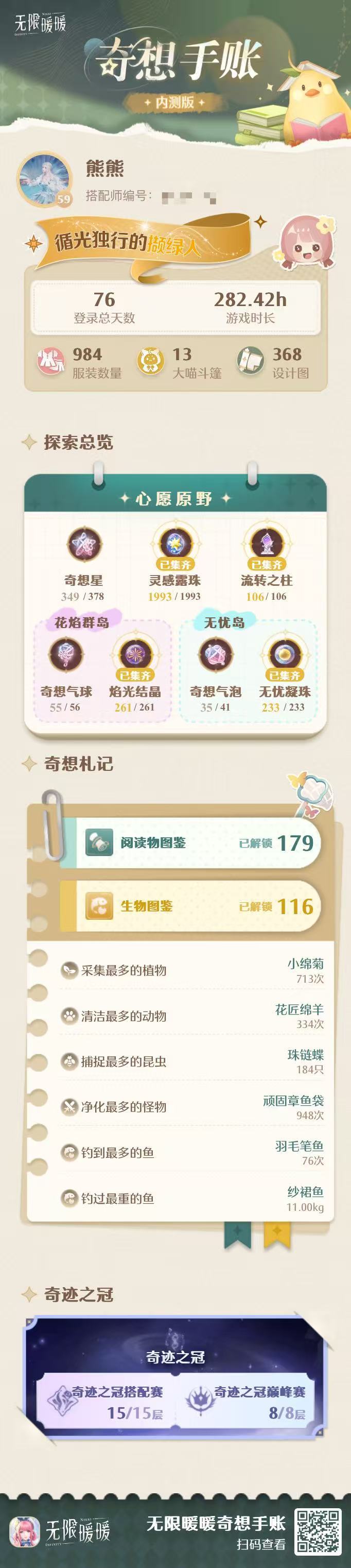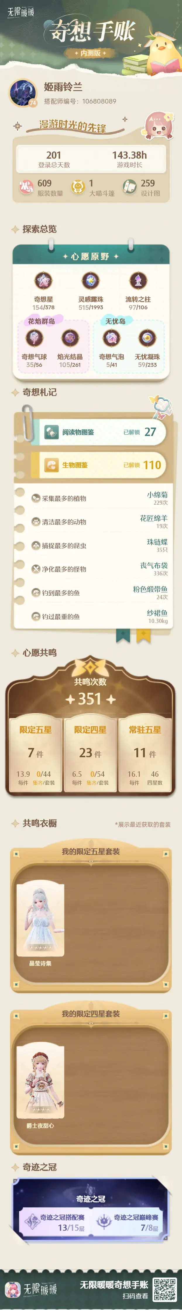 还有一个国际服的小号截不了图,差不多跟第三个号的时间开的,也得一百来个小时了,原来已经这么久了呀#无限暖暖 #无限暖暖奇想手账 #无限暖暖寻访趣味称号
