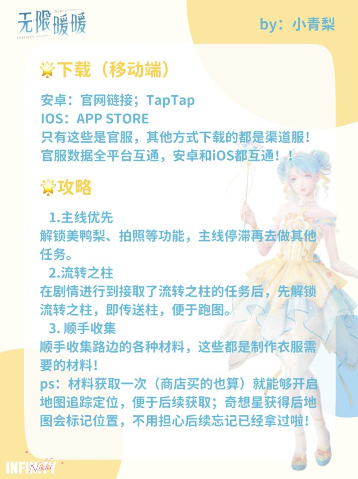 🌟下载(移动端)安卓:官网链接;TapTapIOS:APP STORE只有这些是官服,其他方式下载的都是渠道服!!官服数据全平台互通,安卓和iOS都互通!!🌟攻略1.主线优先解锁美鸭梨、拍照等功能,主线停滞再去做其他任务。2.流转之柱在剧情进行到接取了流转之柱的任务后,先解锁流转之柱,即传送柱,便于跑图。3. 顺手收集顺手收集路边的各种材料,这些都是制作衣服需要的材料!ps