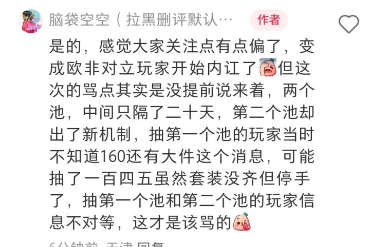 160抽送,那我们140+出大件就停手的算什么?接受你160才送摆件,但你这马后炮什么意思?一千人的项目,出开服池的时候,连二十天后上什么都不确定么?现在发出来知道补救了,那些140多出了头发裙子,以为大件齐了就停手的人算什么?四个二百五其中一个么?这次1.1活动内容少,五星套差(连闪暖被骂疯的海妖套都不如)马上要出的四星和298套同质化我都不说你什么了,但这个160摆件背刺玩家我受不了哈,现在