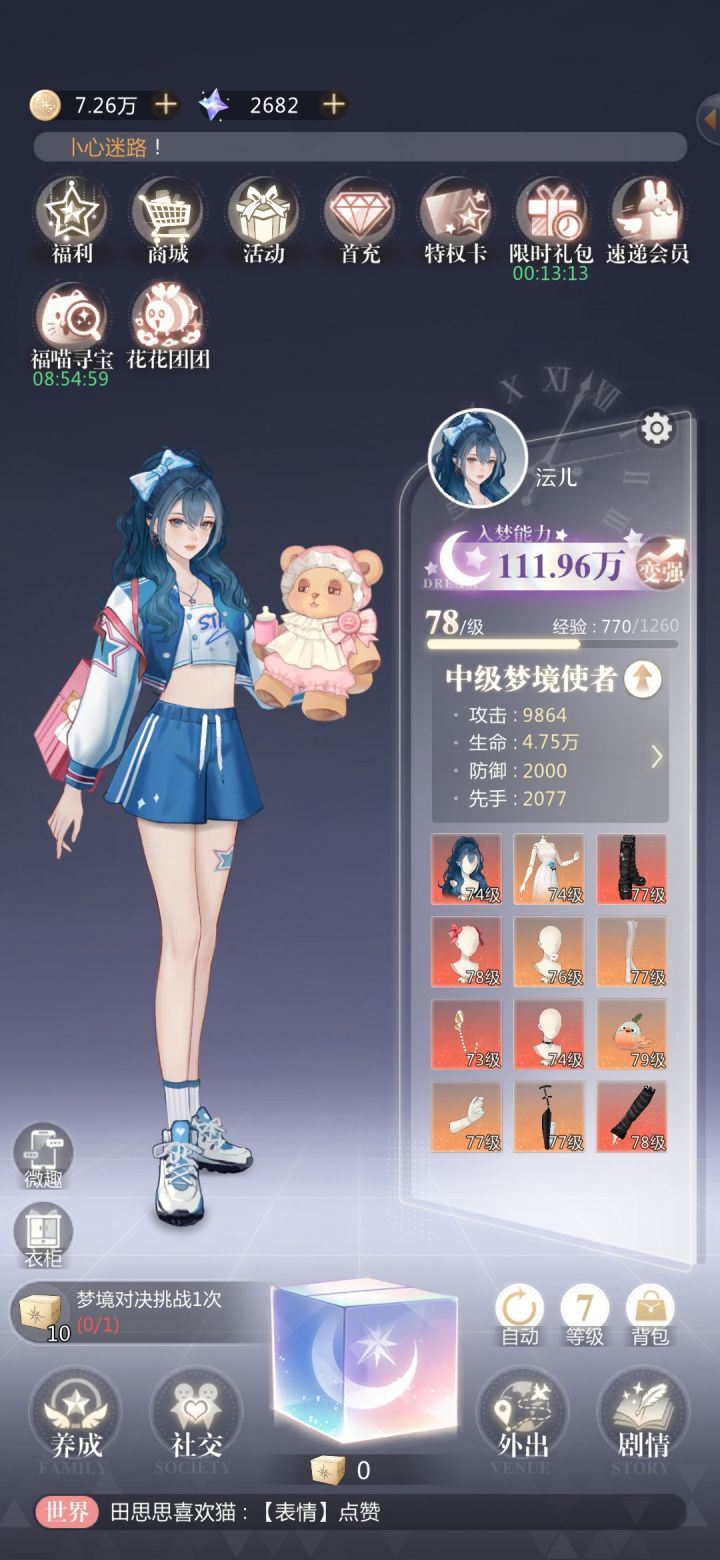 今日份每日一梦: 搭档:星光向野此间心迹+全勤哥 手持:极速光轮+萤火虫之灯+毛绒麋鹿 异能:向葡萄+神圣守护+你与真理+啊啊啊 妆容:抗暴击 无法活过十五回合的宝子,手持换上秋日,异能带上棒棒糖,若还不能活到十五回合,手持再带上抗性,异能再带上滑板。 请宝子们记住常用保命装:秋日,鸽子,抗性,毛绒小包,棒棒糖,滑板(胜利冲锋),小枕头。 需要大家注意的是,不要一味的全带增强搭档的手持和异能,因为