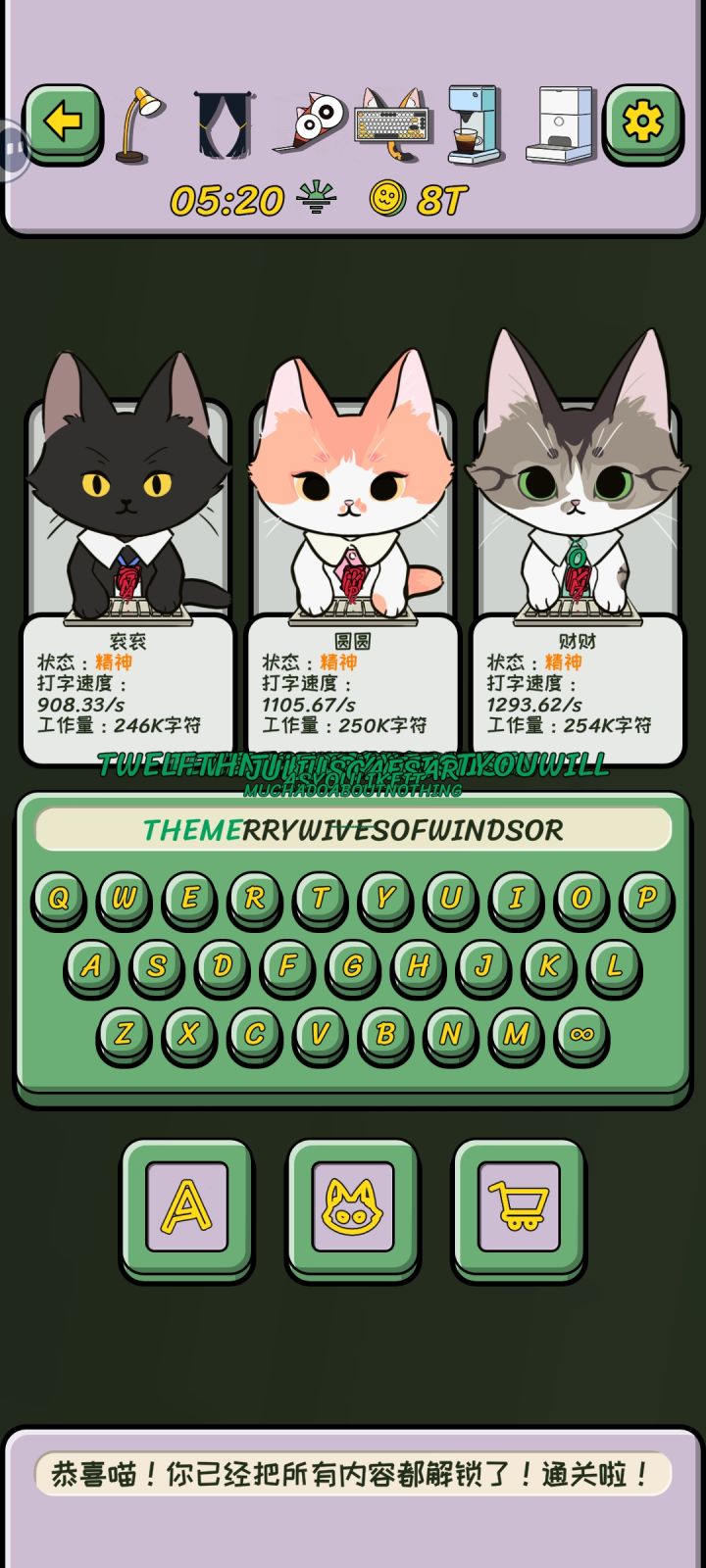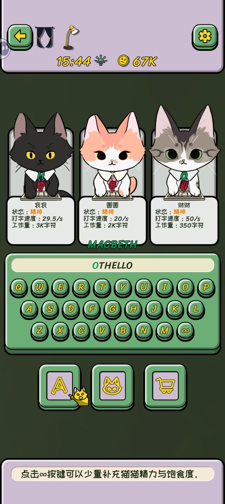 #无限猫猫计划 兄弟,我家猫猫会后空f……咳咳,会打字诶—————————————————有信息⏩⏩⏩ 这是一款画风可爱的放置休闲游戏,主要玩法是雇佣猫猫打字,购买小道具和设备,雇佣更多猫猫更快地打字😼🐈—————————————————— 😼猫才招聘:会打字的猫谁顶得住,必须得雇来好好看看。高级的猫猫更贵。😼著作开模:你可以在这里看到非常多的历史名著:哈姆雷特,李尔王