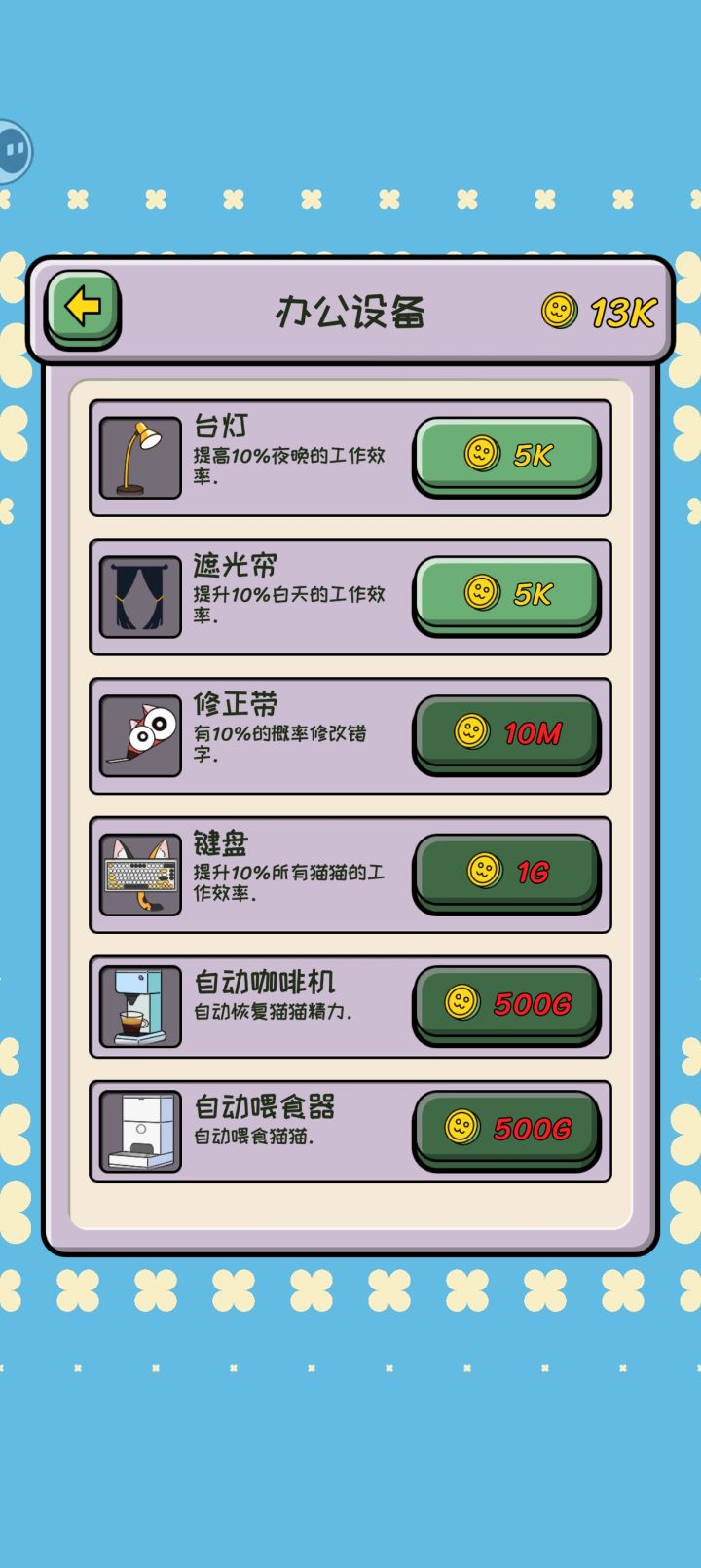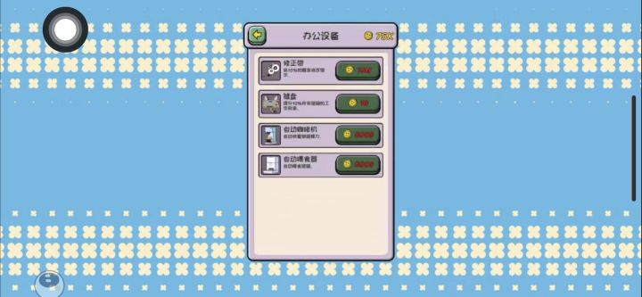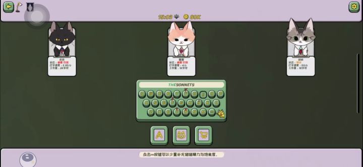 在这个游戏中我们将化身黑心老板(bushi),我们可以雇佣可爱的猫猫打字赚米,还可以购买打字模版提升赚米效率,以及给猫猫工友们添置办公用品增强员工幸福感。游戏整体偏解压休闲,打字的声音超级解压像是在捏泡泡纸。雇佣到三只猫猫后就可以直接挂机( 桀桀桀 ),听猫猫给我们打字的声音。整体没什么可玩性和互动性,我们只需要没事哗啦哗啦键盘,以及在猫猫赚到足够钱后进行购买。不过这个声音真的蛮解压催眠的,以