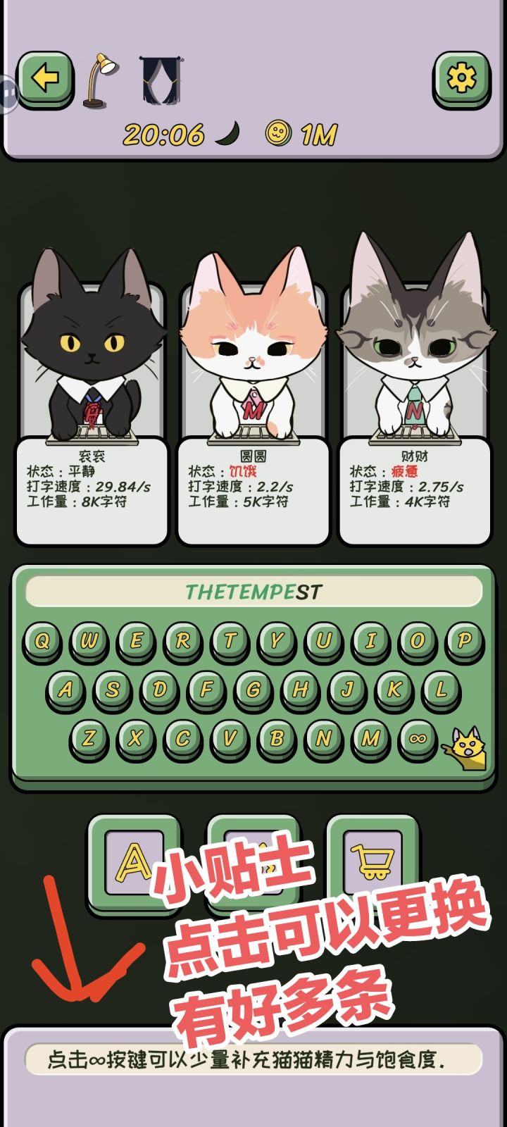 究竟是没睡醒?还是看错了!猫咪居然在打字!全新聚光灯game体验试玩🎮游戏名称:《无限猫猫计划》🔆游戏标签:养成丨经营丨休闲丨竖屏🔍游戏背景:有一天呢林郝博士突发奇想。决定用猫猫进行实验验证无限猴子定理❗于是让猫猫没日没夜地干活,用无限的时间来堆砌出莎士比亚著作!并称之为无限猫猫计划。那么在游戏里呢,你将担任猫猫的管理者协助他完成无限计划。🌈游戏玩法:游戏开始通过购买猫咪以及提升道具