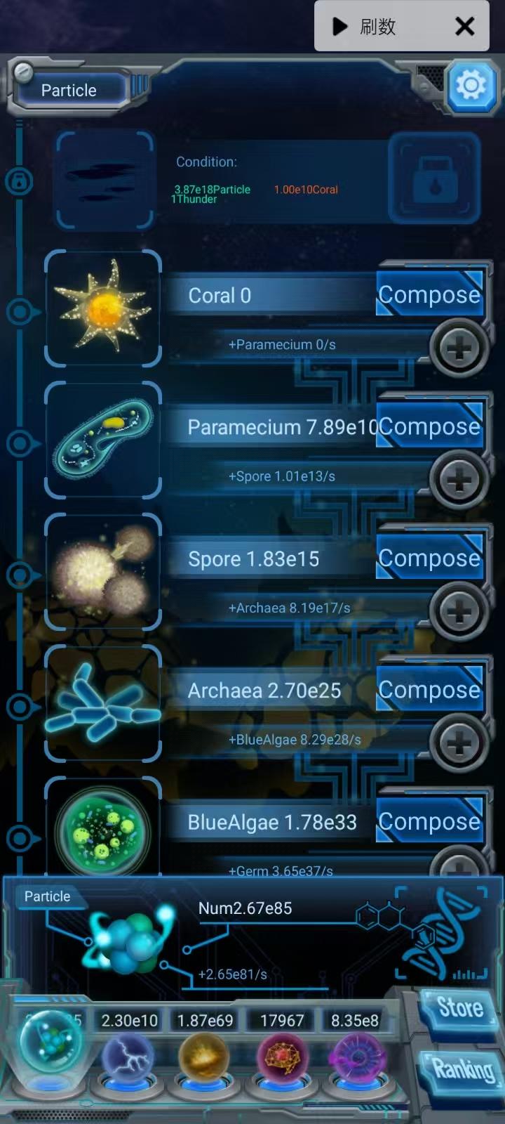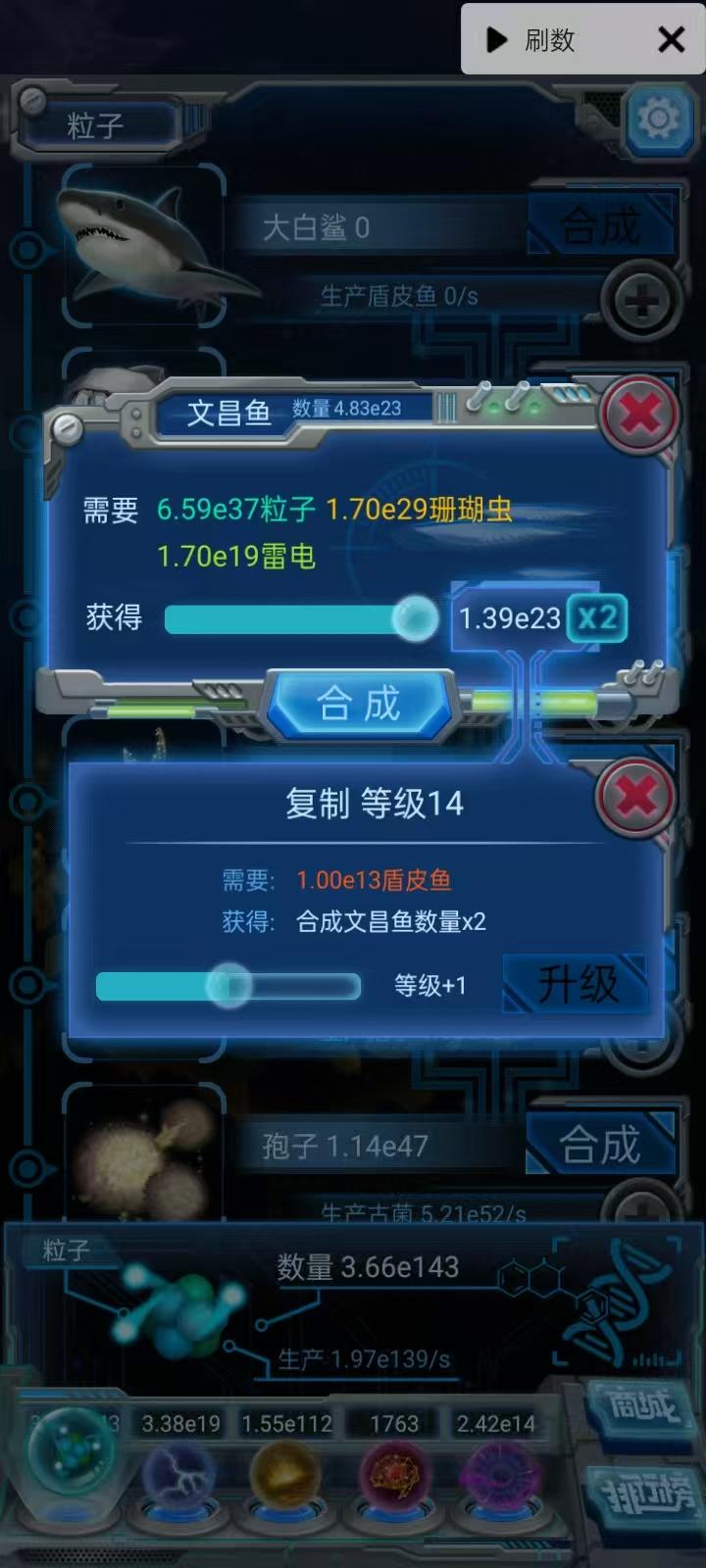 目前小号已经超过大号的进度了,两个号都在草履虫扭曲期,只是进度问题,一个秒产十几个珊瑚虫,大号两秒一个珊瑚虫,小号我屯满闪电,复刻了三次还是四次在进入的草履虫扭曲期,孢子合成等级给我拉到了15级[表情_捂脸哭][表情_捂脸哭][表情_捂脸哭],草履虫合成也到了六级,估计晚上能到达草履虫复制期,到时候又缺电了,脑壳痛[表情_捂脸哭][表情_捂脸哭][表情_捂脸哭],慢慢来吧不弄极致,弄不了,游戏理解