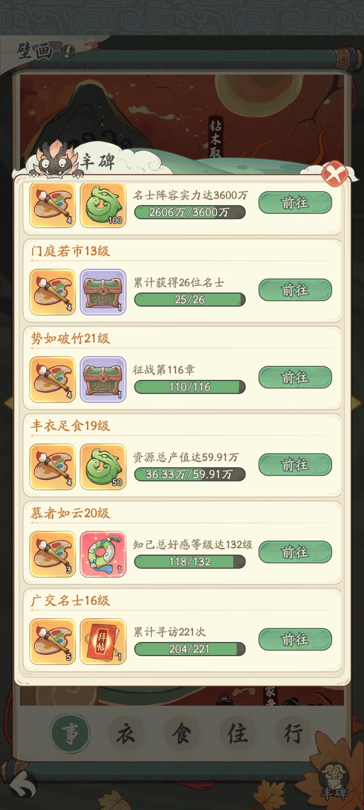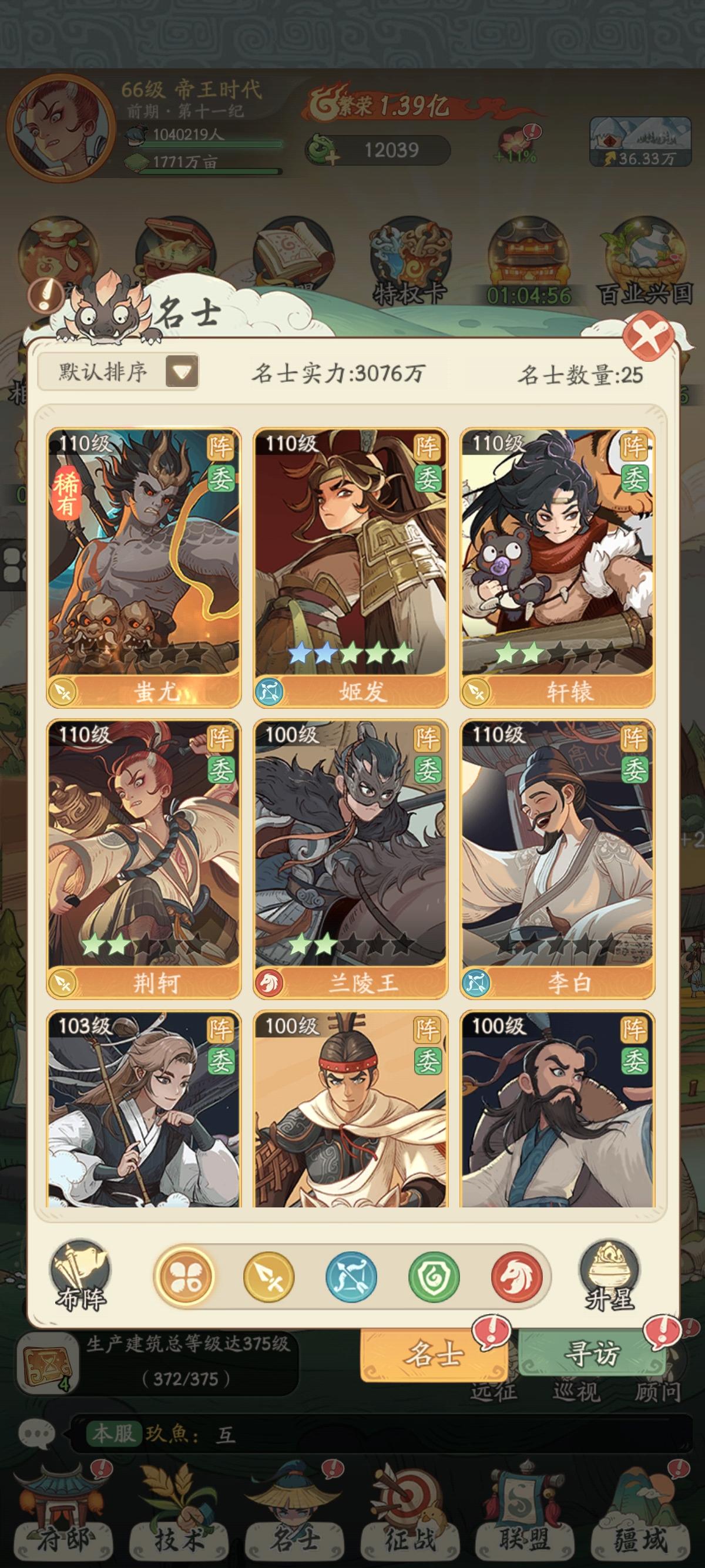 肝了五天的战斗成果:帝王前期(67级),繁荣度:1.71亿10个传奇名仕,5个稀有,算零氪玩家里的名仕天花板了吧!抽卡只抽了200抽(稀有名士开箱子出了两个,抽卡出了三个)时光裂隙打到148,上阵战力2924万,征战打到115。丝绸之路目前一趟有2亿多的收入伐木场:56级;水稻田:56级;铜矿场:52级;采石场:54