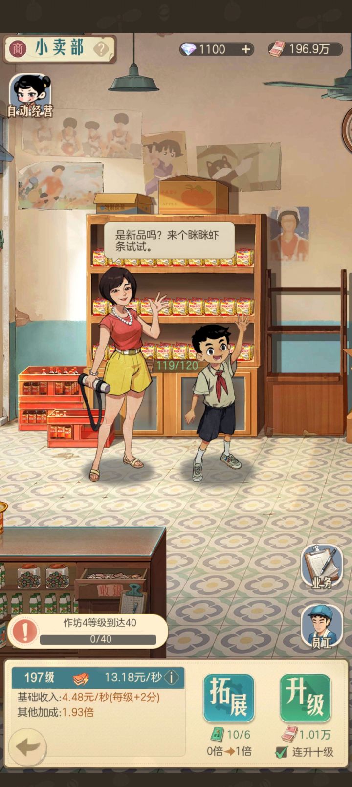 今天给大家带来一款耐玩上头的模拟经营类手游《时光杂货铺》,时间飞逝人生没有重来的机会,我们可以在游戏中回顾90年代的点点滴滴,重温童年。小时候一直羡慕家里开网吧开小卖铺的同学,今天终于能以游戏的方式如愿了。⭐玩法:模拟经营开局摆早餐店,通过经营获得启动资金,租聘店员,升级店铺,从卖油条升级到卖麻球,茶叶蛋升级到卖玉米等等,在升级的过程中玩家可以获得大量的多巴胺感受到快乐。后续会陆续开放小卖