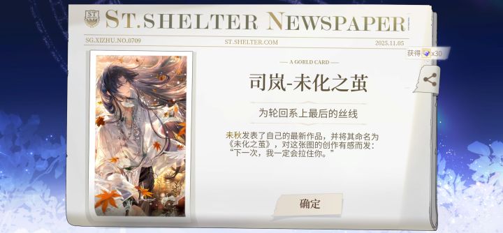 虽然苍穹他坏,虽然这是张花瓶,但是没有关系,卡面够好看就行了。嗯,我的意思是,只要卡面足够貌美,我也可以忽略剧情里他可能给我发的刀子。#时空中的绘旅人司岚