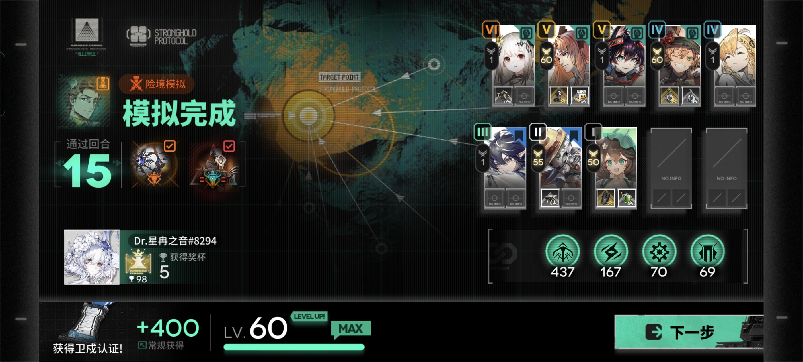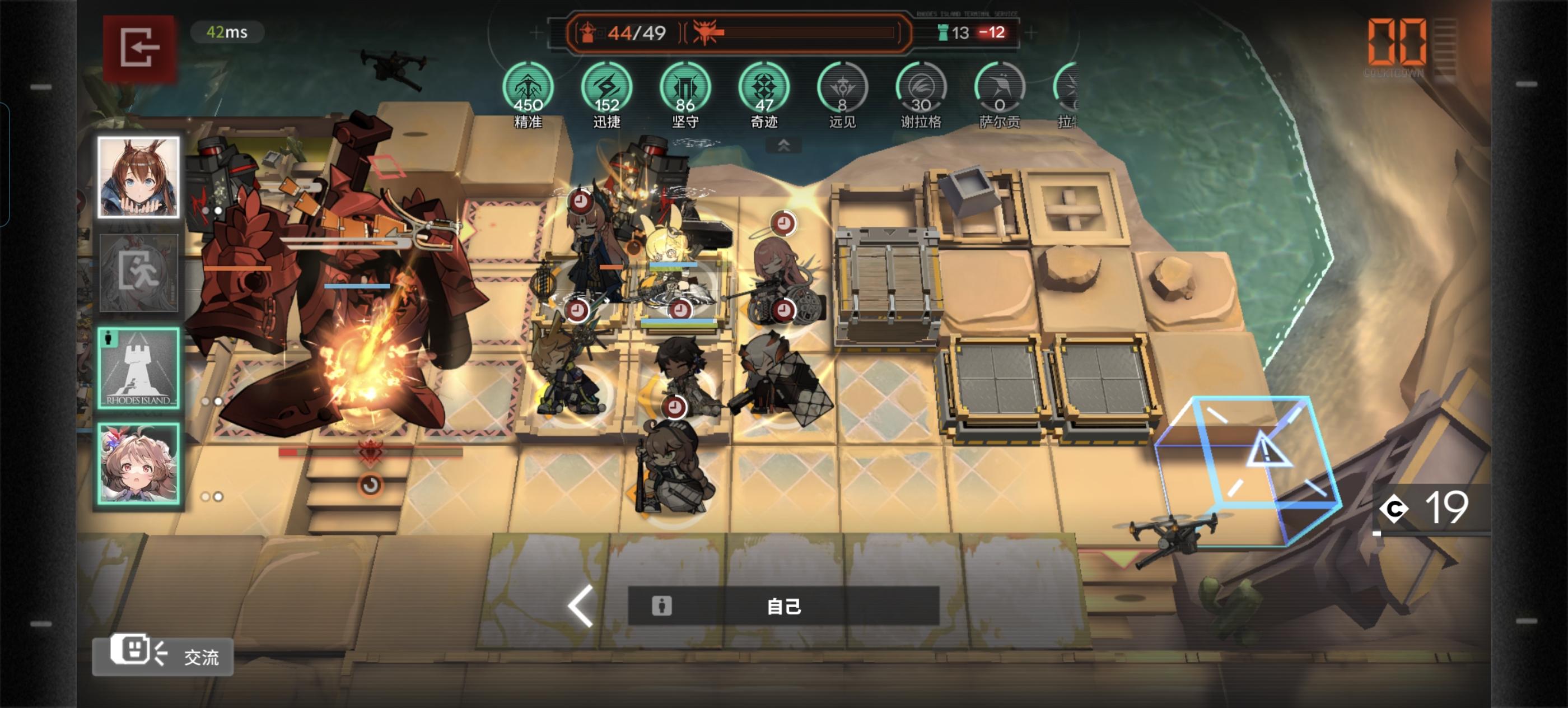 绝境还是太难了,硬推我三坚守后面是咱用精准迅的胡局和天谴局绝境打了两把全输了,险境只要关键干员没有被ban三个以上,大小号打了近20把,基本能赢关键在于优先叠迅捷,在高迅捷的情况下有异客可以每回合叠60~80层精准,顺手叠灵知或者坚守来提高dps或者生存能力,除了绝境的频次怪和损伤怪会漏,基本可以保证在12,13回合给队友兜底不过这把真的难打,中途退了一个,一个一百层的炎,一个五百层的拉特