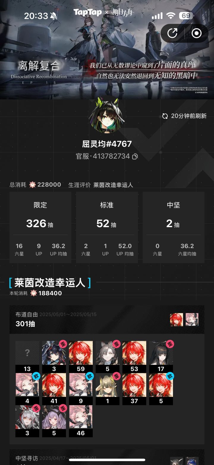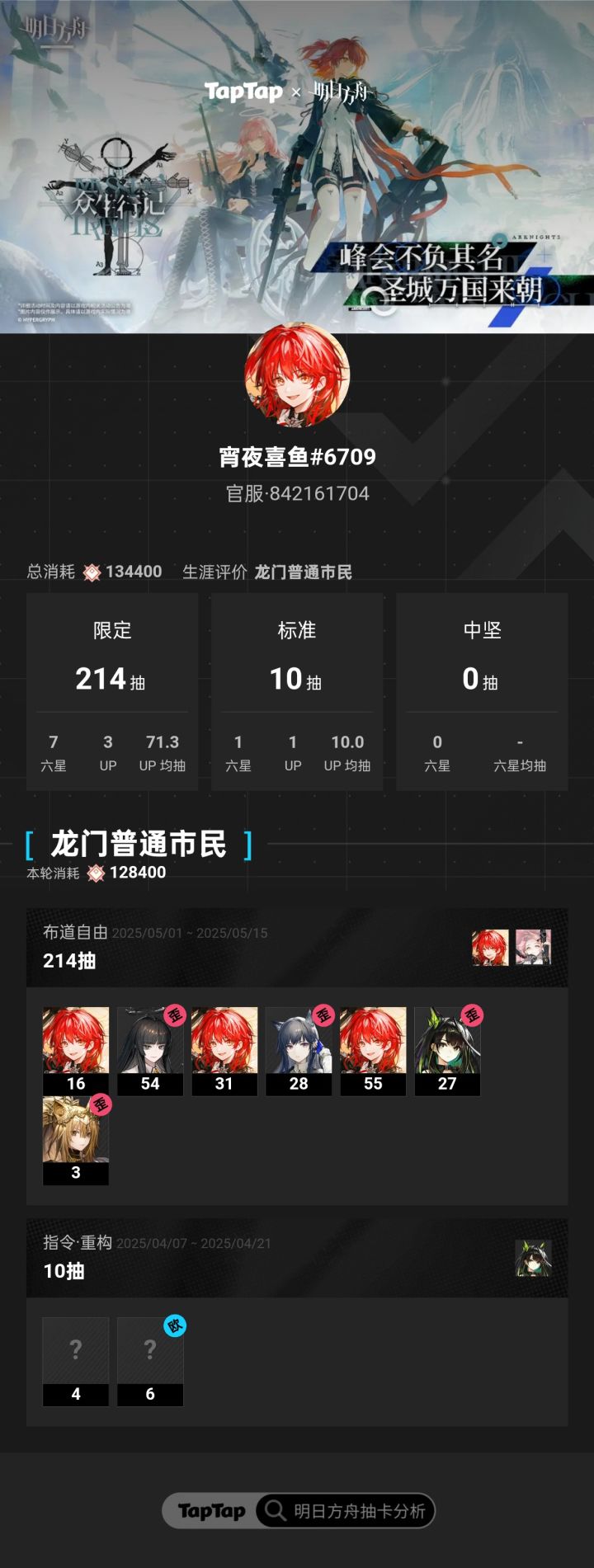 我勒个火星人后知后觉从去年9月底入坑一直在隔壁看的抽卡。tap早该上线这个功能啦!毕竟平时都在这边氵(bushi只可惜去年9月入坑到今年2月年限池记录都没有,只能接受这个残缺了。刚刚绑定同步数据过程蛮丝滑的,夸!去年10月半周年是经历的第一个限定池角对萌新的我挺好的,第一发图图,没多久就异拉了。那时候不懂见好就收,想着多歪几个万一能有忍冬、异德balabala呢?然后多抽了8