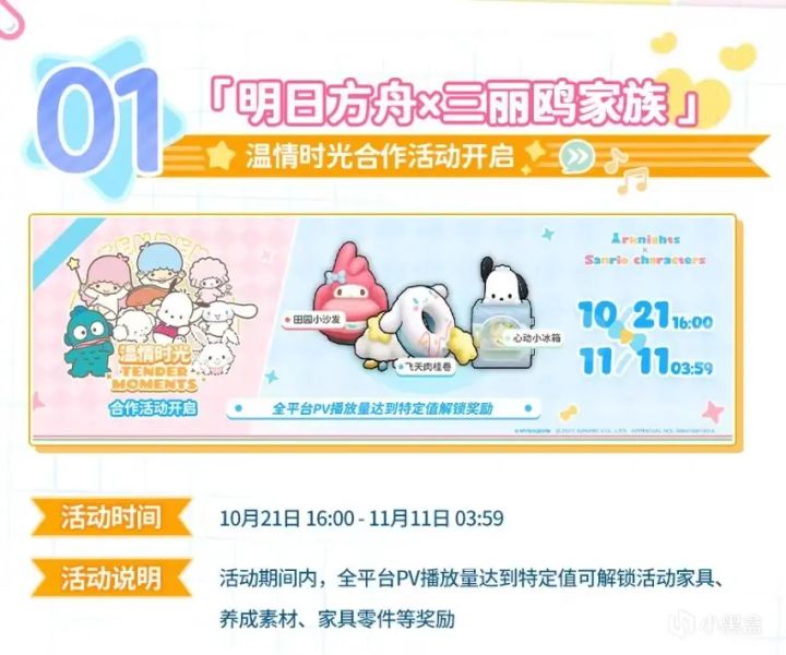 《明日方舟》x 三丽鸥家族「温情时光」合作宣传PV现已公布,内容包括:《明日方舟》x 三丽鸥家族「温情时光」合作活动《明日方舟》x 三丽鸥家族,组合包限时上架《明日方舟》x 三丽鸥家族,新装限时上架《明日方舟》x 三丽鸥家族,复刻时装限时上架【温情时光合作活动】活动时间:10月21日16:00-11月11日03:59活动说明:活动期间内,全平台pv播放量达到特定值可解锁活动家具、养成