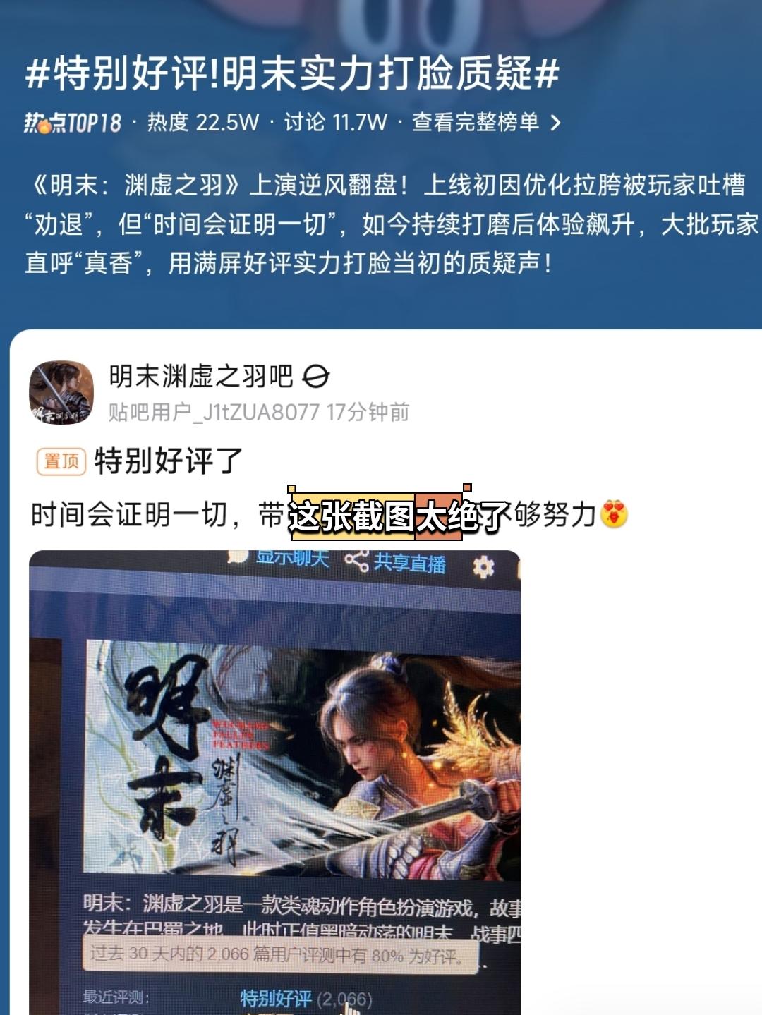 #主机单机 #明末渊虚之羽 #资讯评论员 近日,一则关于明末好评率变化的相关话题引发了网友热议事件省流:明末上线初因优化拉胯、剧情等问题被玩家吐槽“劝退”,但“时间会证明一切”,如今持续打磨后体验飙升,大批玩家直呼“真香”,游戏好评率提升至特别好评明末上线爆炸,事后都能逆风翻盘,这说明玩家还是很宽容的至于明末这款游戏怎么到逆风的就别管,反正它翻盘了部分网友对此看法,态度倾向于嘲讽