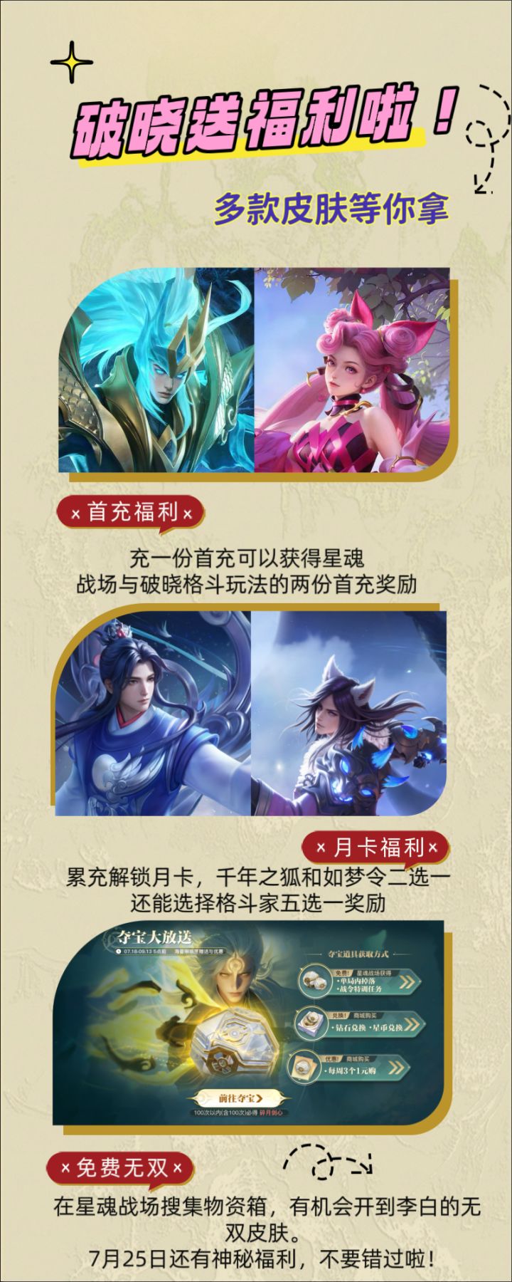 王者荣耀星之破晓暑期福利不断!首充送皮肤,月卡送福利解锁多款皮肤,还有免费抽李白无双皮肤活动!7月25日还有神秘福利!千万不要错过啦! #星之破晓 #星之破晓星魂战场