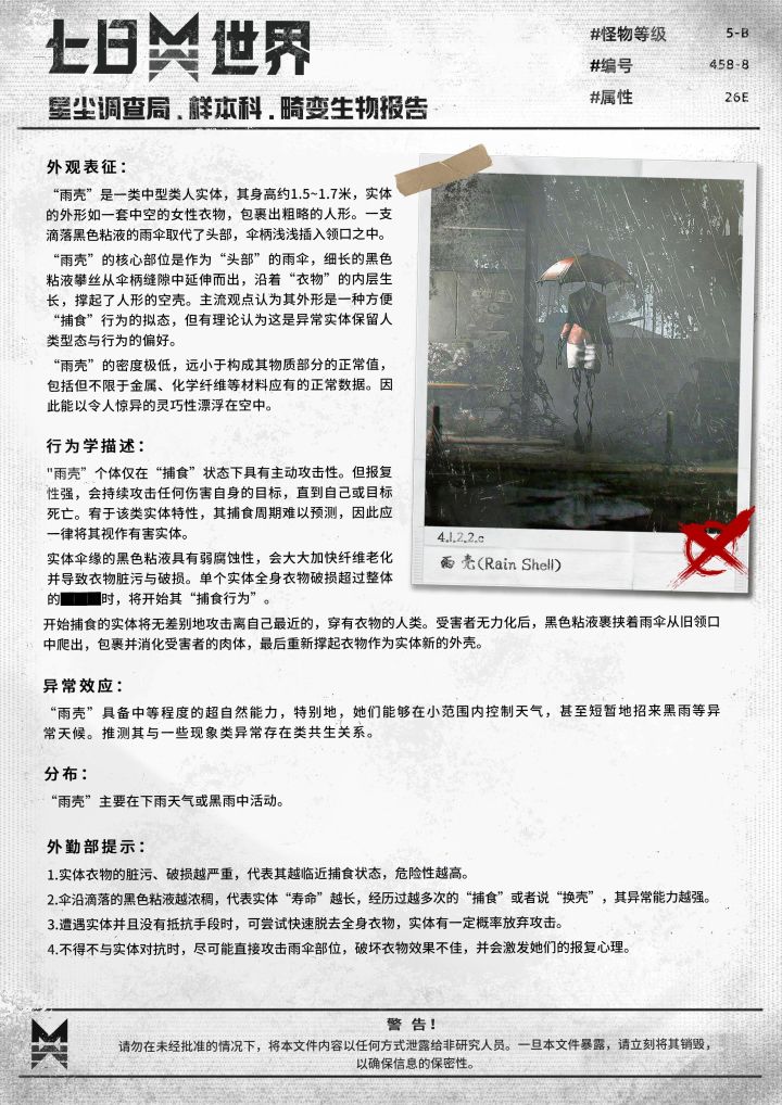 尽管我越来越熟悉这里的生活,但最近的天气总让我有些摸不着头脑,每一天都充满着不确定性。天空突然下起了黑雨,我和一位打着红伞的女士在废弃公交站的两端躲避这黑色的粘液,雨声让沉默变得尴尬起来。我随手翻开在废墟里找到的报告...上面的照片,是不是有些眼熟?#七日世界#星尘调查局