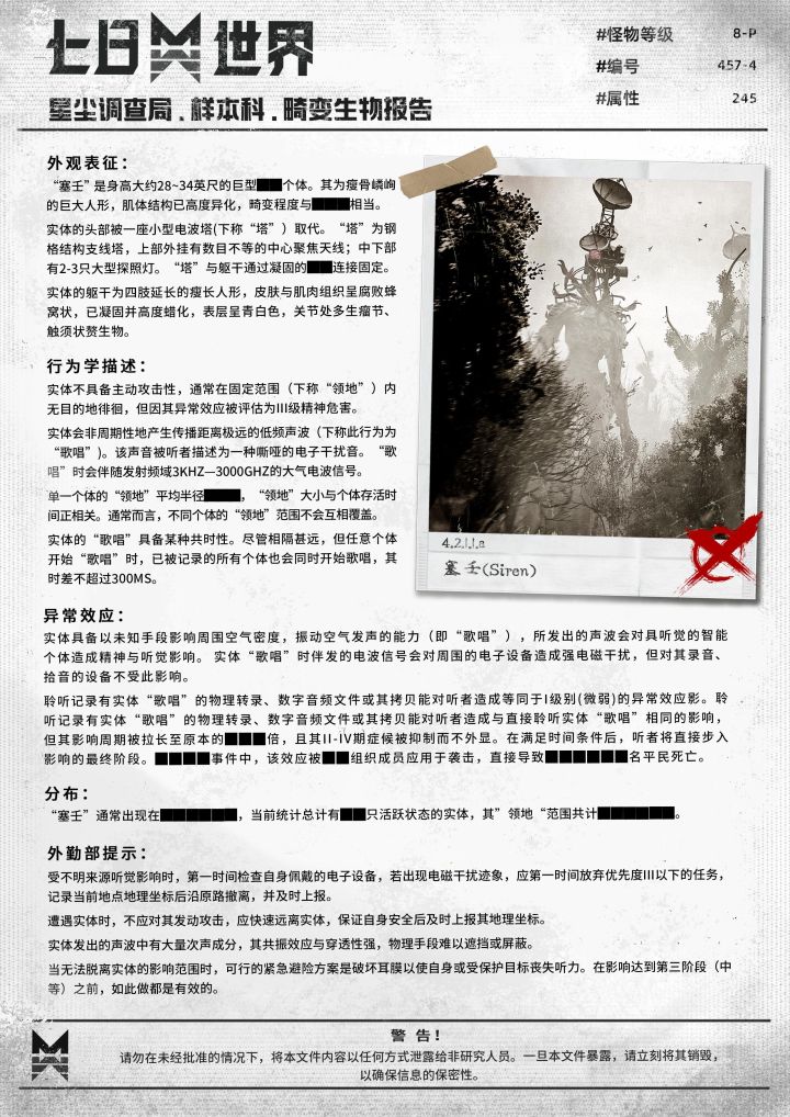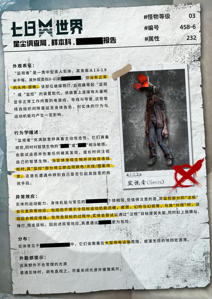 昨天我接到了一项临时任务,要前往调查巨楔的情况。在那里我意外地发现了一张文件,上面的文字像是被人刻意涂抹过,隐约能看出是一份《畸变体样本报告》。这可真是个令人费解的东西,让我更加好奇这份报告的调查人员是否还安好呢?#七日世界#星尘调查局