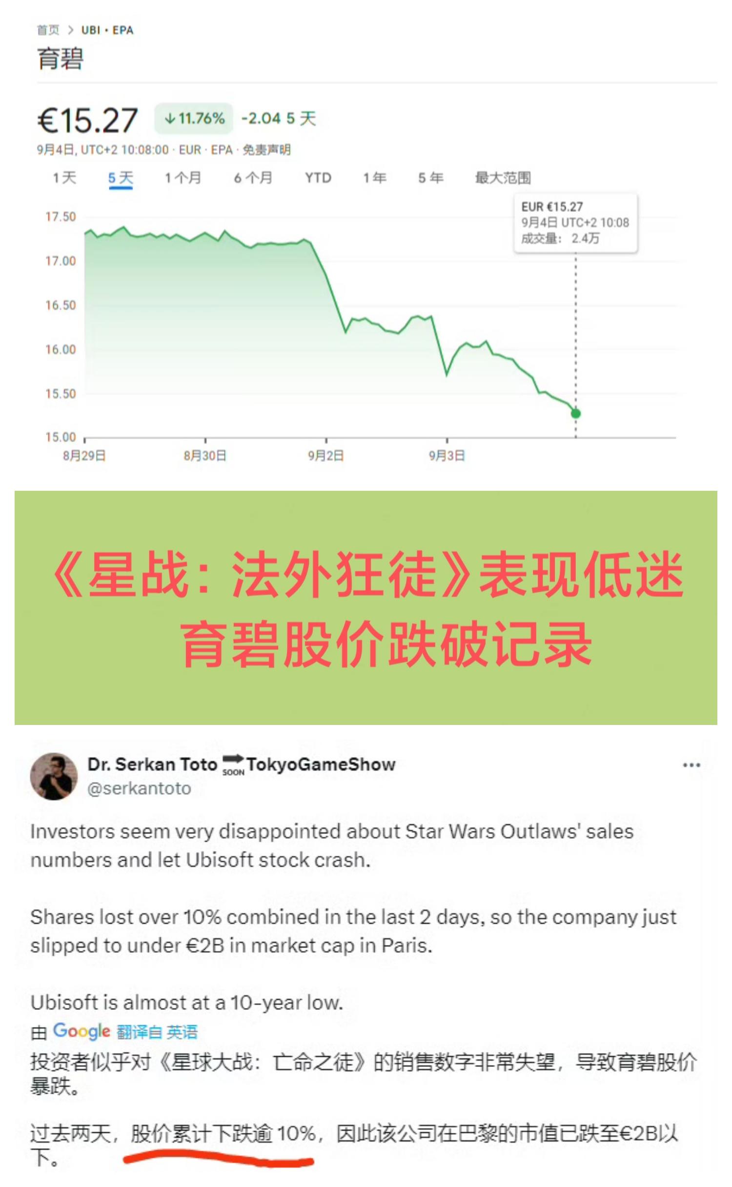 9/3号晚,业内分析师Serkan Toto表示,导致育碧股价暴跌的原因,是投资者对《星球大战:法外狂徒》的成绩失望所致《星球大战:法外狂徒》8/30上线,但育碧的股价在近段时间里下跌了10%以上每股跌至15.5欧,市值跌破20亿欧,达到十年来的历史最低点个