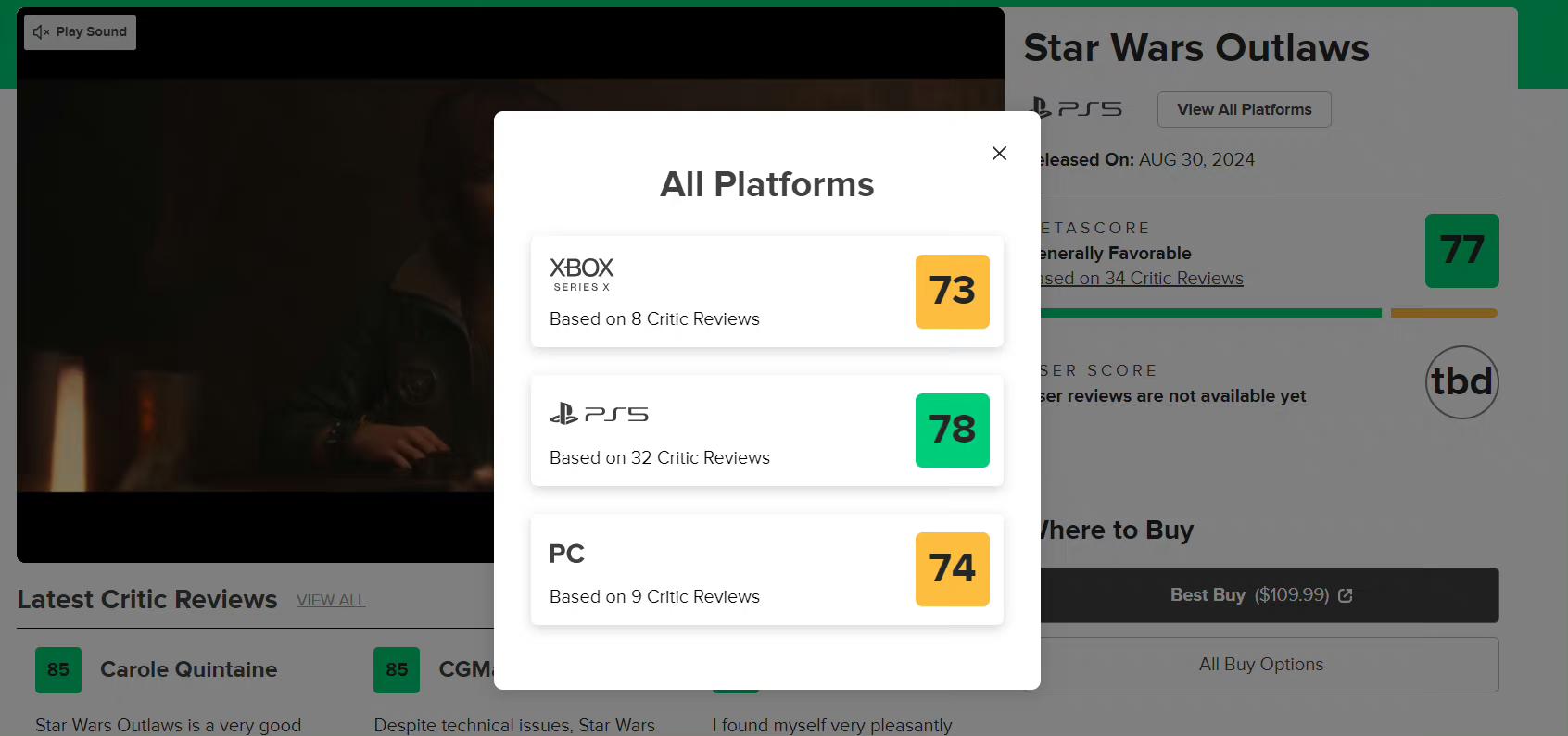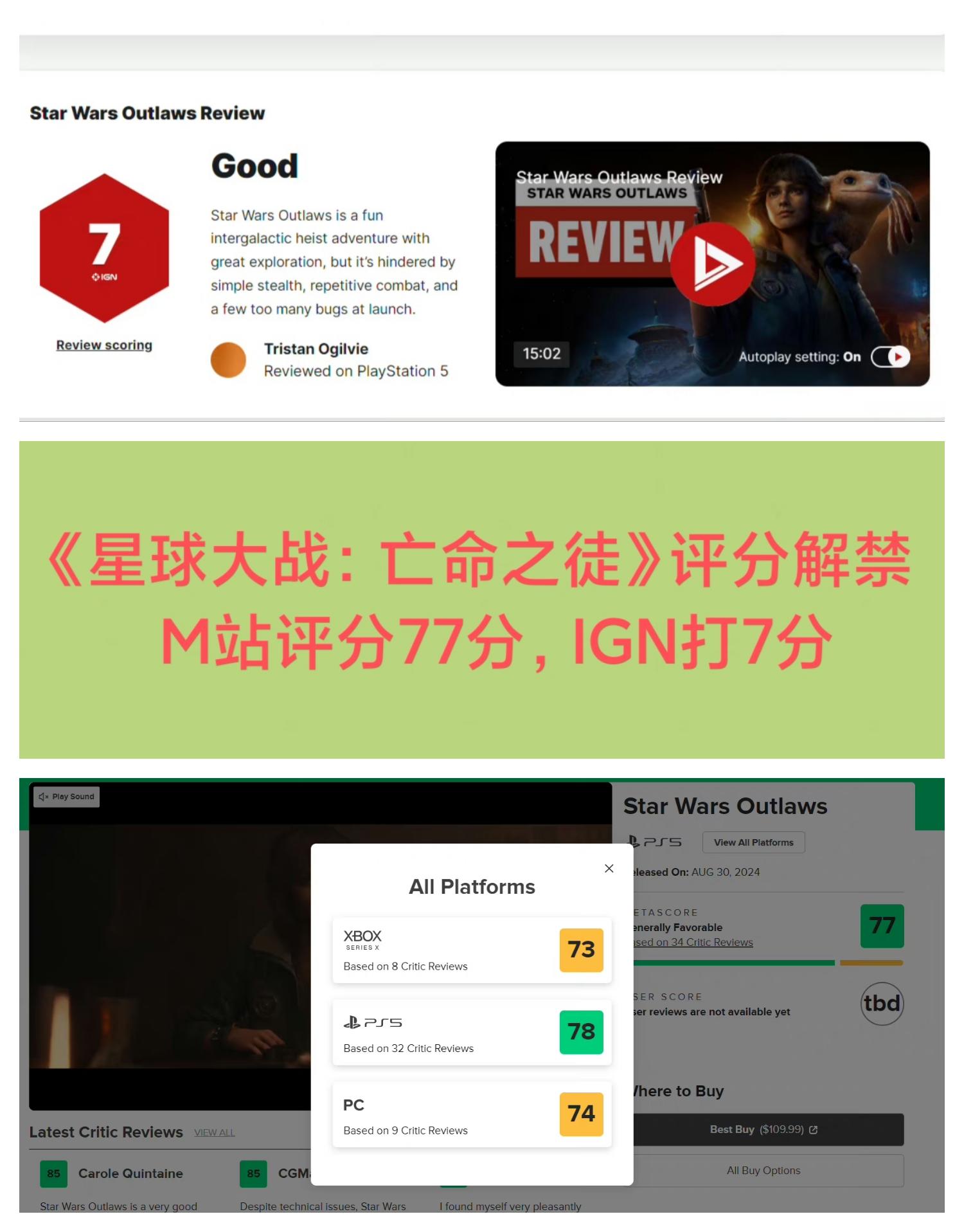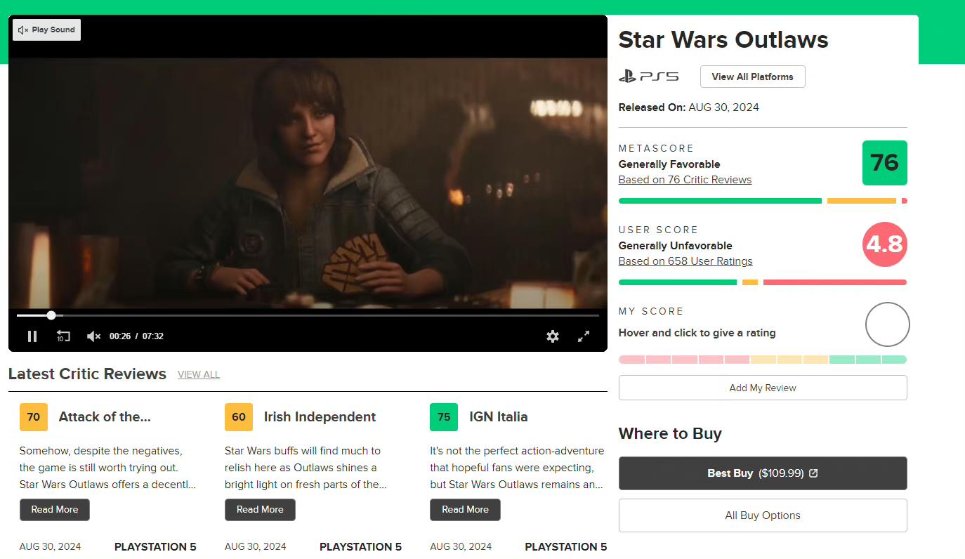 8/26号,育碧旗下最新作《星球大战:亡命之徒》媒体评分现已解禁❗❗❗MC网站得分为78分(PS5版),XBOX版73分,PC版74分IGN给出了7分,测评编辑认为:“它也受到简单的潜行、重复的战斗以及发布时过多的bug的影响,有时会让你失望”总的来说,这一款勉强合格的作品,没有太大的优缺点节奏