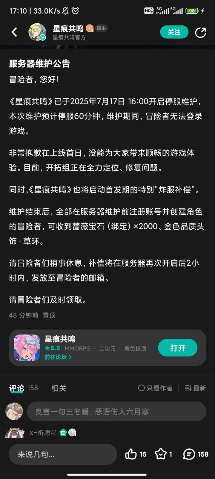 中午一点把我踢下线,到五点补偿2000,可不是到6点补偿2000,偷偷给游戏公告改了不加奖励是吧,没注册的玩家领不到是吧,祝你早似#星痕共鸣 #星痕共鸣创作征集 #星痕共鸣冒险者创作激励 #星痕共鸣创作者 #星痕共鸣共鸣测试 #星痕共鸣创作者协会 #星痕共鸣定档7月上线 #星痕共鸣造星计划 #星痕共鸣创作者协 #星痕共鸣首曝 你游开服首日开服时间比不上炸服时间,似了喵
