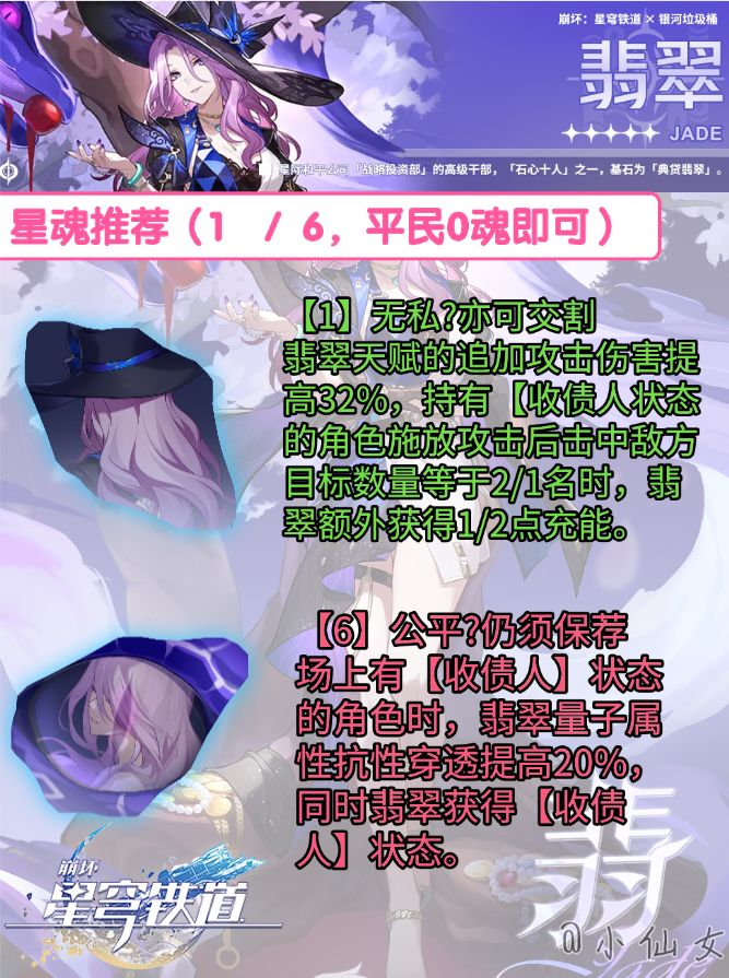 UID:104719728【角色TAG】追加攻击、群攻、加速、附加伤害【角色定位】翡翠是一名能够指定我方单体成为【收债人】,通过自身或【收债人】攻击敌方目标获得充能点,以触发追加攻击的输出型角色。翡翠发动天赋的追加攻击时,立即获得可叠加的暴击伤害提高与攻击力提高的效果。翡翠是一名智识命途的量子属性角色,拥有特殊的收债人机制,可与高频队友进行配合。主要使用追加攻击和终结技进行群攻输出。还拥有全游