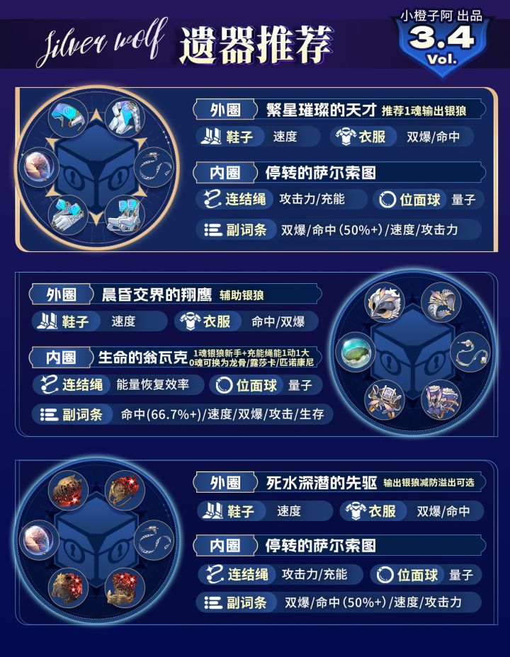 UID:104802274哈喽喽,这里是小橙子阿,本期是银狼的角色攻略!本篇将用图文形式讲解银狼的技能机制、光锥选择、星魂解析、遗器以及队伍搭配。「这次能让我玩得开心点吗?」 银狼是一位量子属性的虚无命途角色,核心能力是战技的挂弱点机制,帮助队伍跨属性作战。但银狼可不仅仅只有挂弱点,无论是战技的对应属性以及全属性减抗,终结技的全体减防,还是天赋的【缺陷】debuff,银狼可快速地为敌人挂上一
