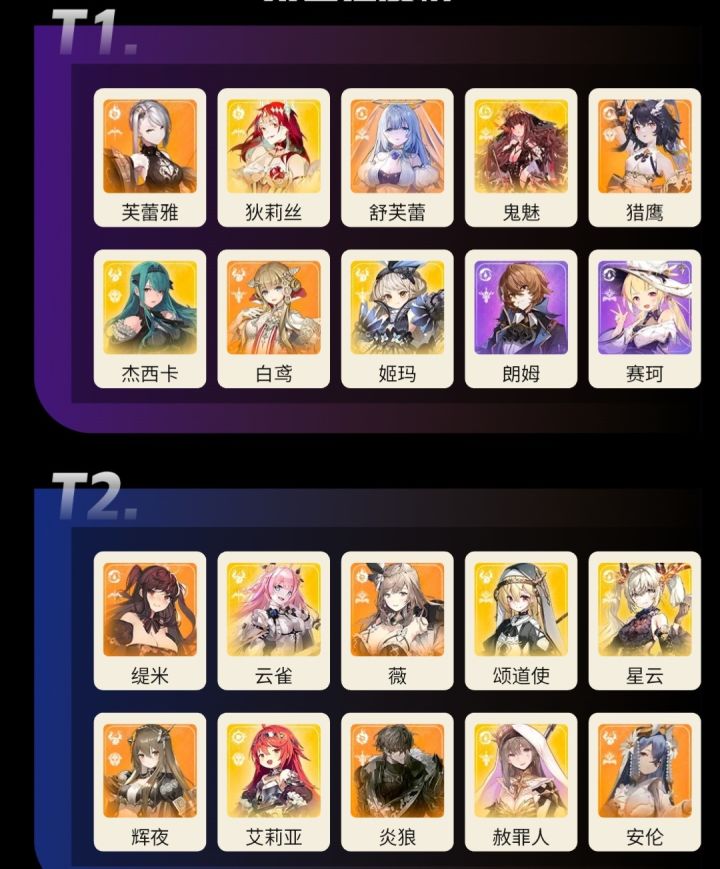 t0只有伊涅利丝,最强输出,在各个模式都有极强的发挥,但是强绑定白鸢,而这游戏的异刃挺难评价的,如果不是因为机制在,我甚至不愿意带任何一个异刃。t1的标准是在攻击、生存、控制、对策中至少有一个突出点,或无下位替代。【狄莉丝】拥有本游戏最强的队长技,并且攻击和控制都相当优异,配队必带。【舒芙蕾】dot队的输出位,输出仅次于伊涅利丝,但强绑多个队友,没有队友直接划入t3。【杰西卡】pvp唯一指