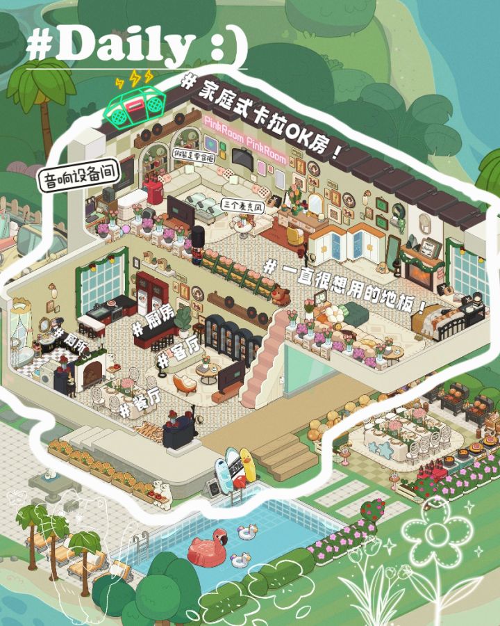 以后我的房子一定要装修一个卡拉OK房!墙上是琳琅满目的零食 伸手就能拿到饮料最重要的是要有三个手麦!还设置了一个音响设备房夸一下黑红配色的厨房真的好好看 复古风满满但是可不可以把这个颜色的厨房柜安排一下手动@房东模拟器还装修了自助餐餐厅这个的灵感是在装修别墅的时候我真的好想吃自助餐因为上次吃自助餐还是在上次#春光市理想家计划#房东模拟器#游戏安利#攻略