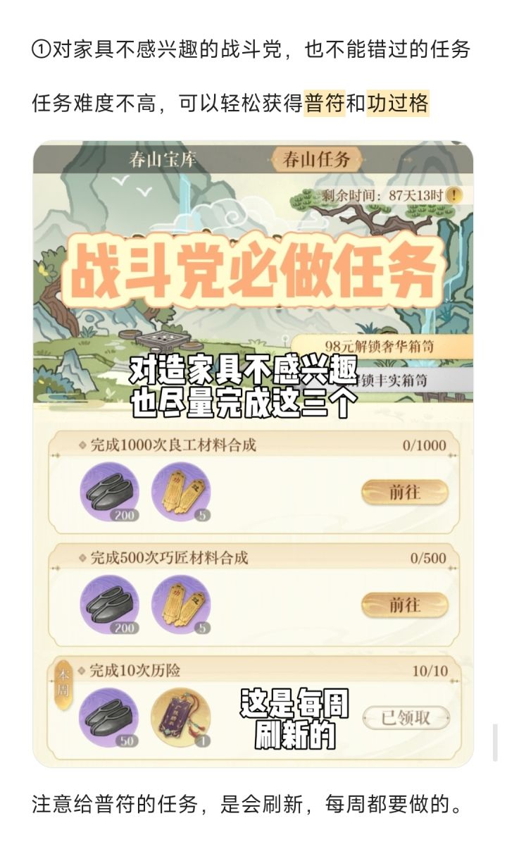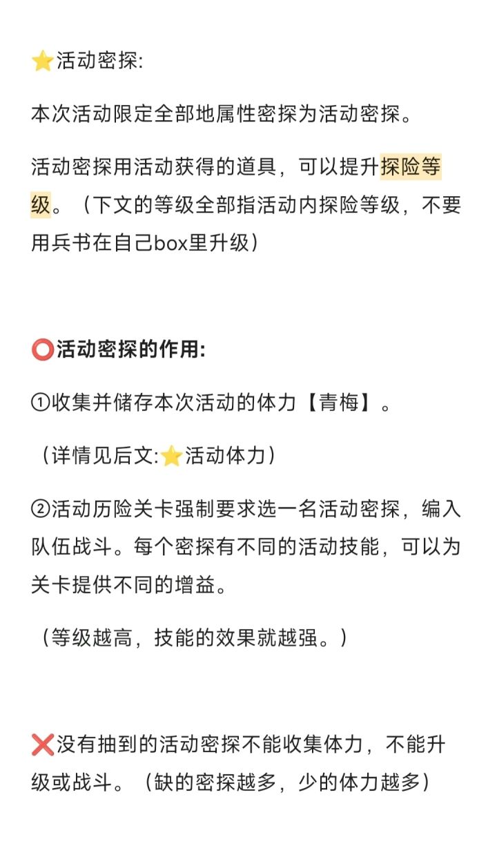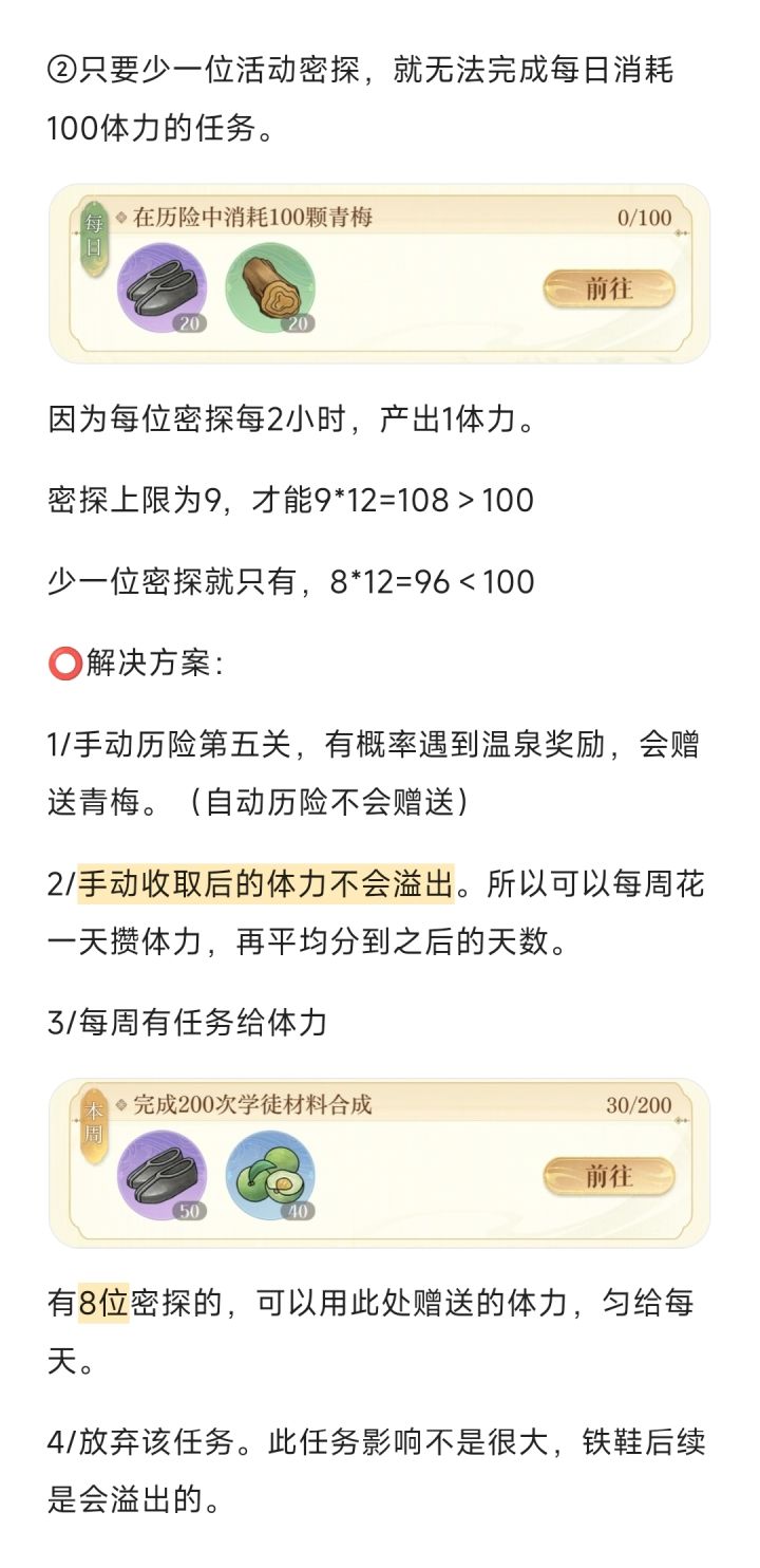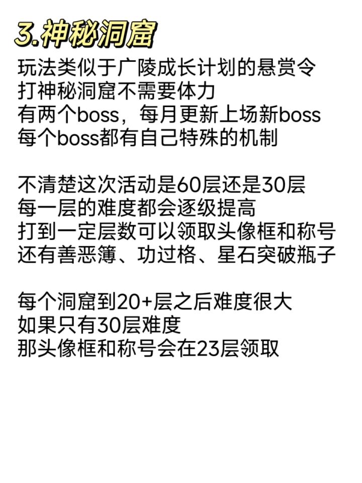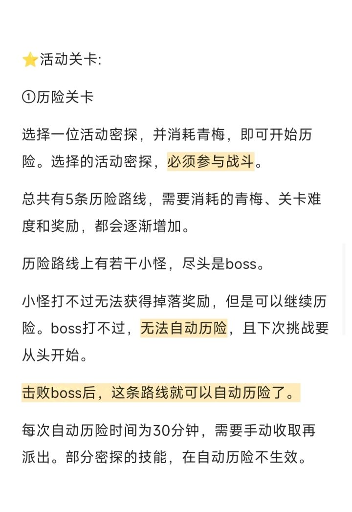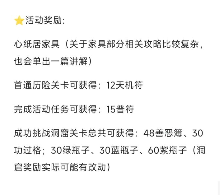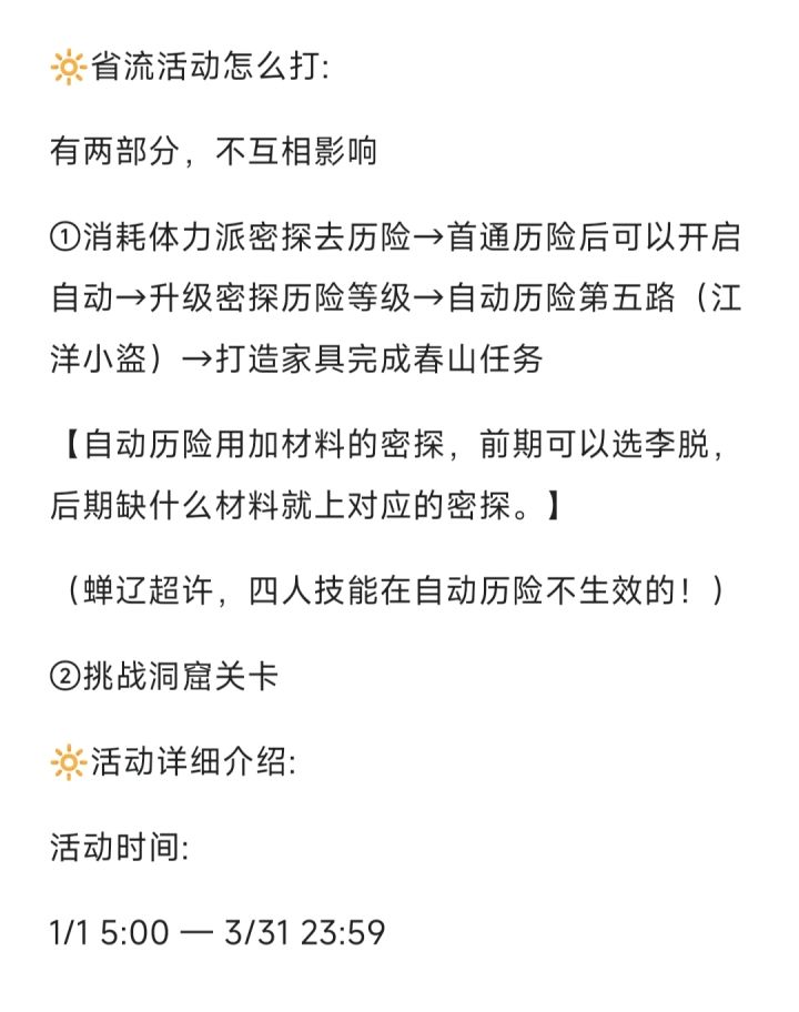 这次活动可以分成两个部分看 一是春山重重的主体活动,给五位男主的心纸居打造家具的,获得的奖励都是打家具的材料。 二是神秘洞窟,给的奖励是经验书、五铢钱、善恶簿等其他奖励,还会有紫星曜、橙星曜、增加历练次数的道具 注意事项: ⭕这次活动需要获得大量的五铢钱,这几天可以多刷一刷6-24和金钱历练攒一攒 ⭕如果练度不够打不过后面的关卡,可以把体力用在前面的自动历练里,也可以获得奖励 ⭕每周完