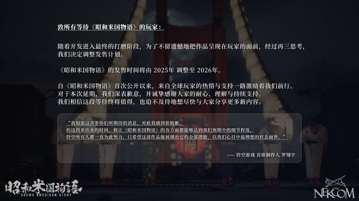 《昭和米国物语》是一款向80年代流行文化致敬、以浓烈B级片风格呈现的全新RPG作品。在本作中,玩家将扮演死而复生的少女「蝶子」,在沦为日本经济和文化「殖民地」的美国,踏上一场「追寻真相与复仇」的末世冒险之旅,并在漫长的旅途中结识伙伴、克服艰险、努力生活、不断成长。《昭和米国物语》将登陆PS5、PS4以及PC平台,发售日未知。