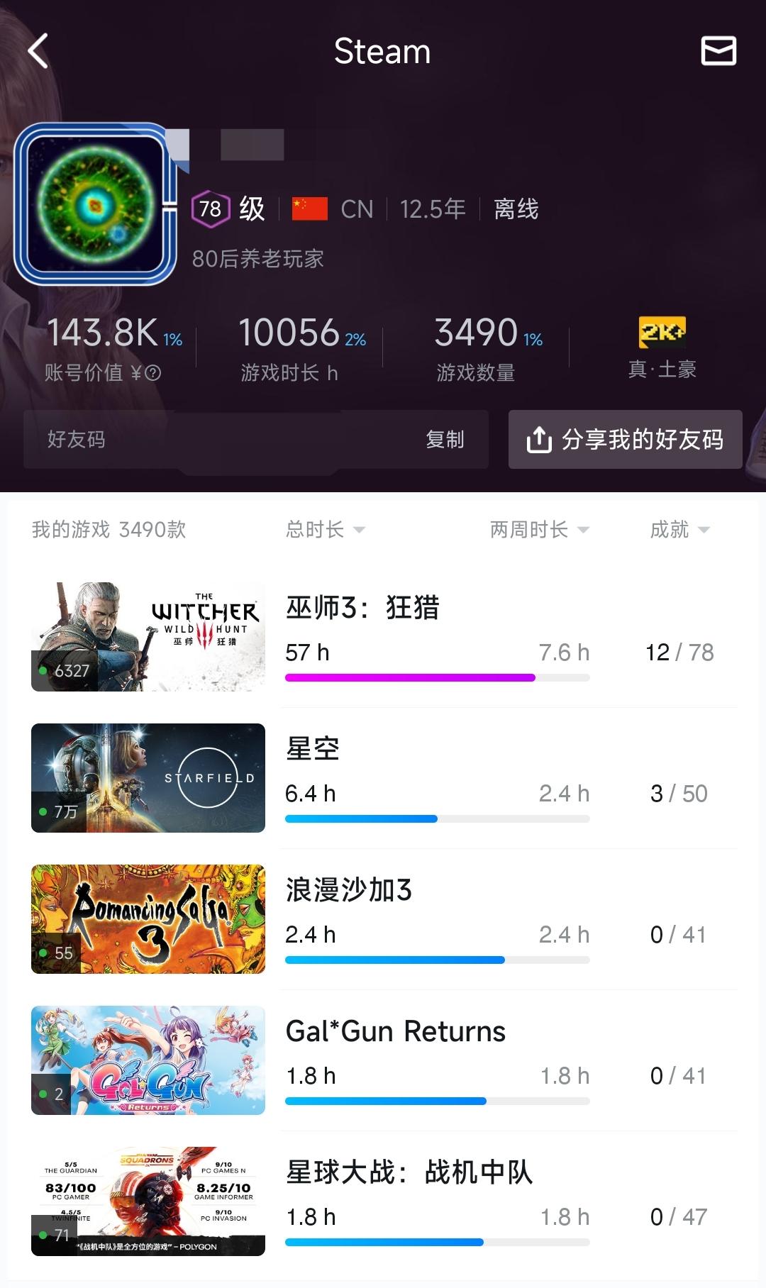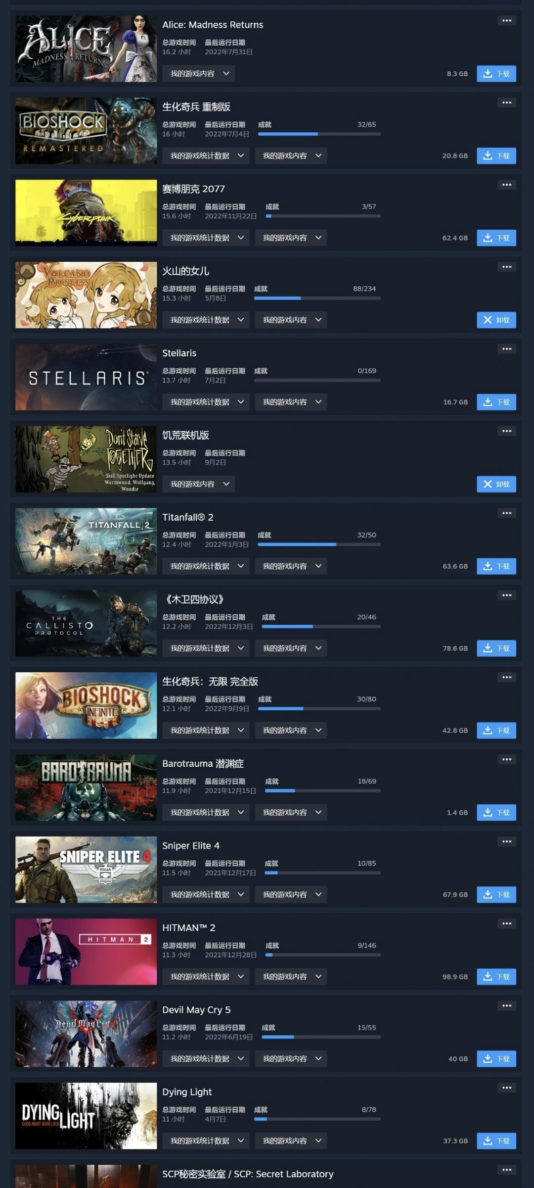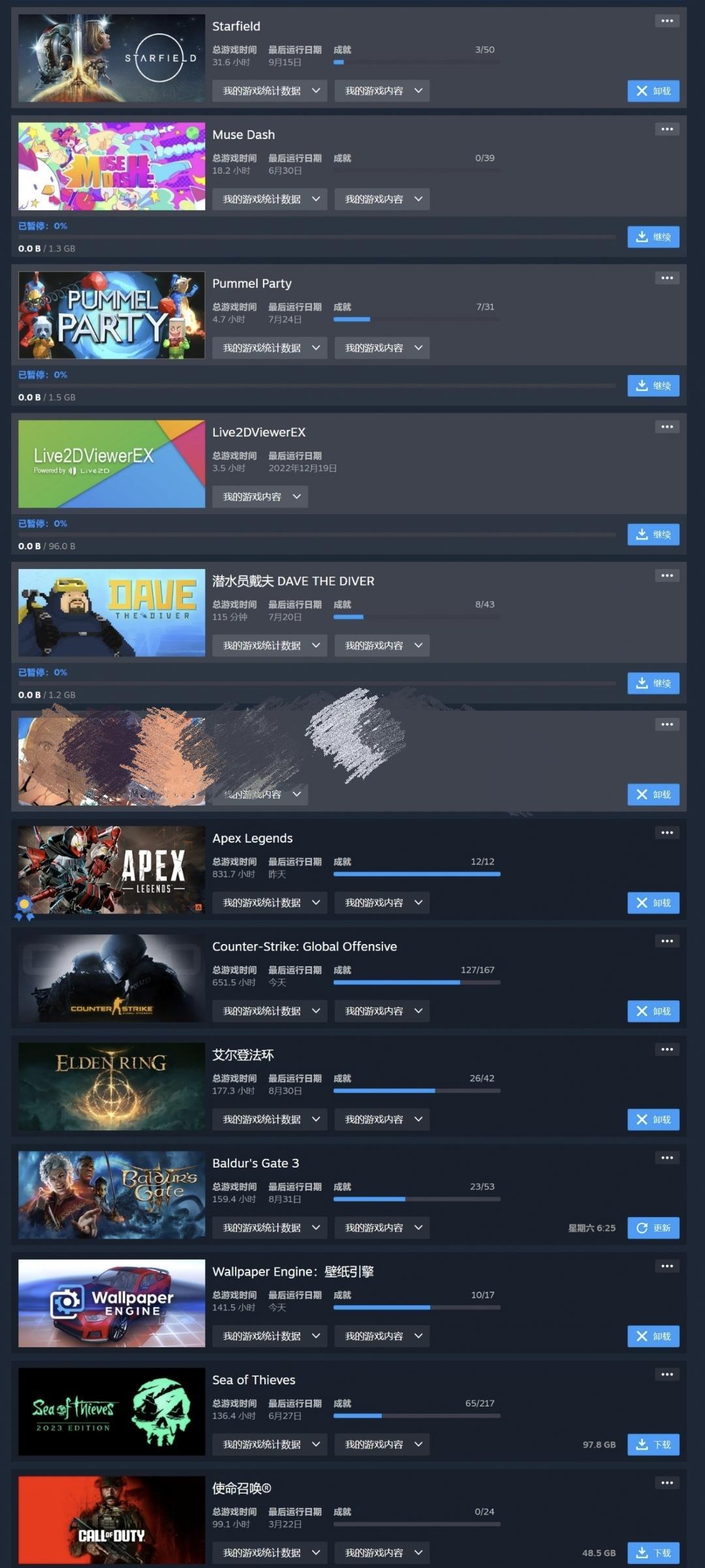 看了一下还真不少,看着还能想起不少。突然发现,越是等了越久的游戏,感觉越拉胯了,就比如星空,还有2077。但是也有不少推荐的游戏,比如博德之门,原子之心,还有比较经典的消逝的光芒。还有一些推荐舍友一起玩的,特别特别开心那种,森林两部曲,木筏,还有最赞的盗贼之海。非常推荐(图片实在发不出来~)#晒晒我的Steam游戏库#游戏安利