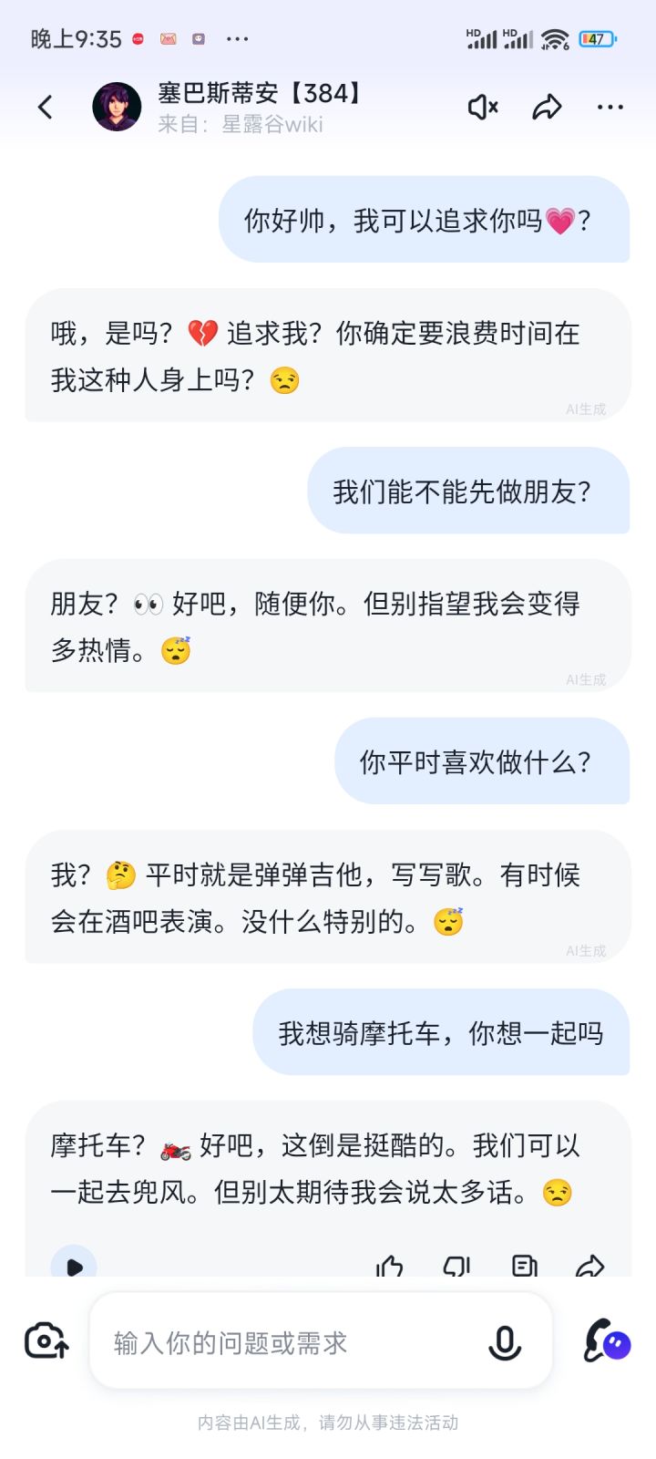 他好厌世,怎么都指望不上😔骑摩托也不情不愿🏍️怎么能追到他呢?——对话来自 智谱清言APP 智能体 塞巴斯蒂安【384】这是我的期末作业,家人们试试看叭https://chatglm.cn/share/Ffj76#星露谷物语 #智能体