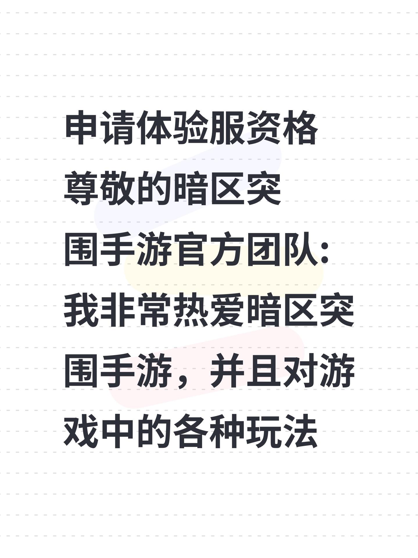 申请体验服资格 尊敬的暗区突围手游官方团队: 我非常热爱暗区突围手游,并且对游戏中的各种玩法和设定有着浓厚的兴趣。我非常希望能够成为暗区突围手游体验服的一员,以便能够更深入地了解游戏的玩法和机制,为游戏的发展贡献自己的力量作为一名玩家,我深知体验服的重要性。同时,我也可以与其他玩家一起交流学习,提高自己的游戏水平 。我拥有良好的游戏习惯和素质,遵守游戏规则和社交礼仪我热爱分享和交流如果有幸被给予资