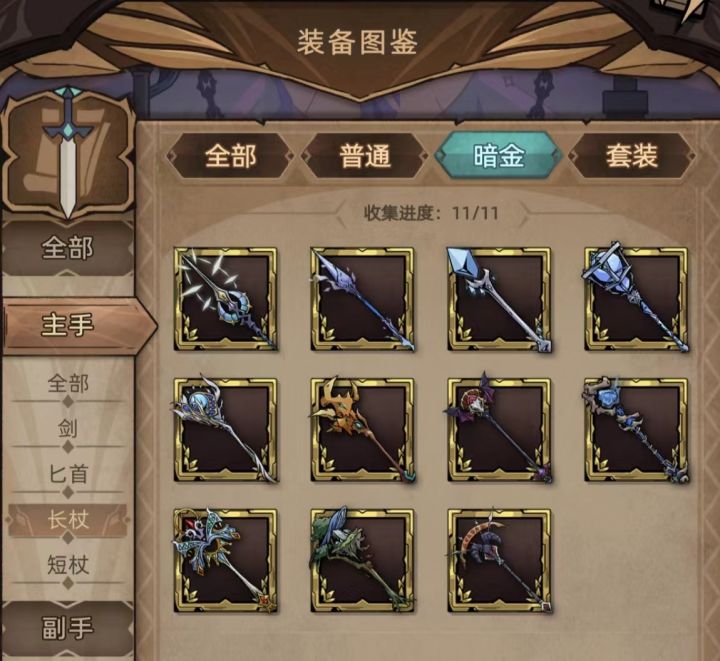 法师装备图鉴-主手 本图鉴按【暗金】→【套装】→【符文之语】的顺序分类。 本系列图鉴中,左下方表示装备词条,右下方表示强化属性 更多图鉴内容,请前往 装备图鉴总目录 (一)暗金篇-长杖 截止到2023年4月1日,暗金长杖共11件。1. 太古魔刃杖 掉落地点:魔界腹地-9; 关键词:装备主属性、攻击间隔降低、元素抗性、免伤贯通、镶孔、双重暴击、额外伤害。2. 贪欲尖刺 掉落地点