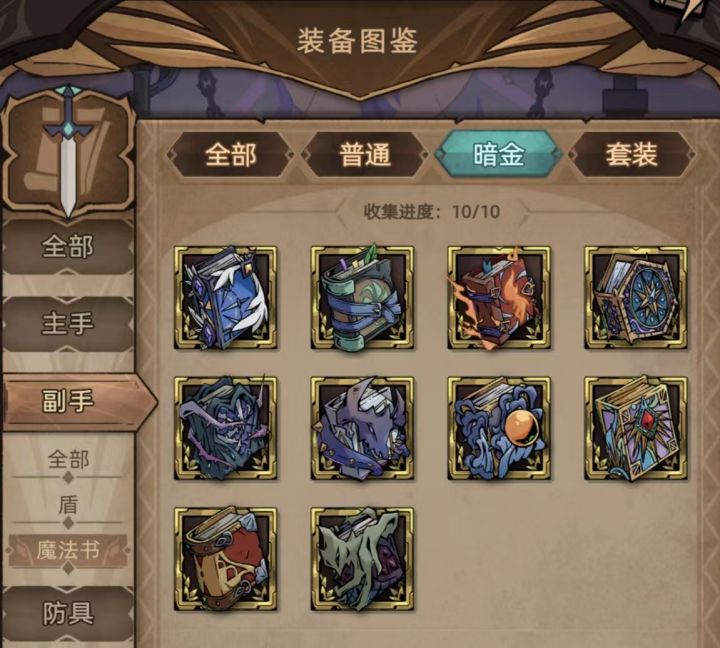法师装备图鉴-副手 本图鉴按【暗金】→【套装】→【符文之语】的顺序分类。 本系列图鉴中,左下方表示装备词条,右下方表示强化属性 更多图鉴内容,请前往 装备图鉴总目录 (一)暗金篇 截止到2023年4月9日,暗金魔法书共10件。1. 极光圣典 掉落地点:古伦内城-10; 关键词:一转技能等级、生命、元素抗性、免伤贯通。2. 末路的第三章节 掉落地点:地下花园-5; 关键词:装