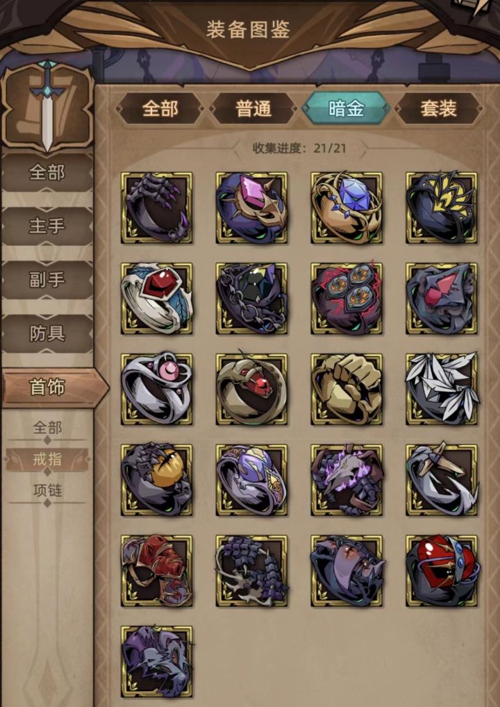 通用装备图鉴-戒指 本图鉴按【暗金】→【套装】→【符文之语】的顺序分类。 本系列图鉴中,左下方表示装备词条,右下方表示强化属性 更多图鉴内容,请前往 装备图鉴总目录(一)暗金篇 截止到2023年4月28日,暗金戒指共21个。1.黑龙骨爪 掉落地点:魔界深渊-6; 关键词:元素穿透、全元素增幅、降低肃正、额外伤害(火属性伤害)。2. 黯淡魔力 掉落地点:地下花园-6; 关键词: