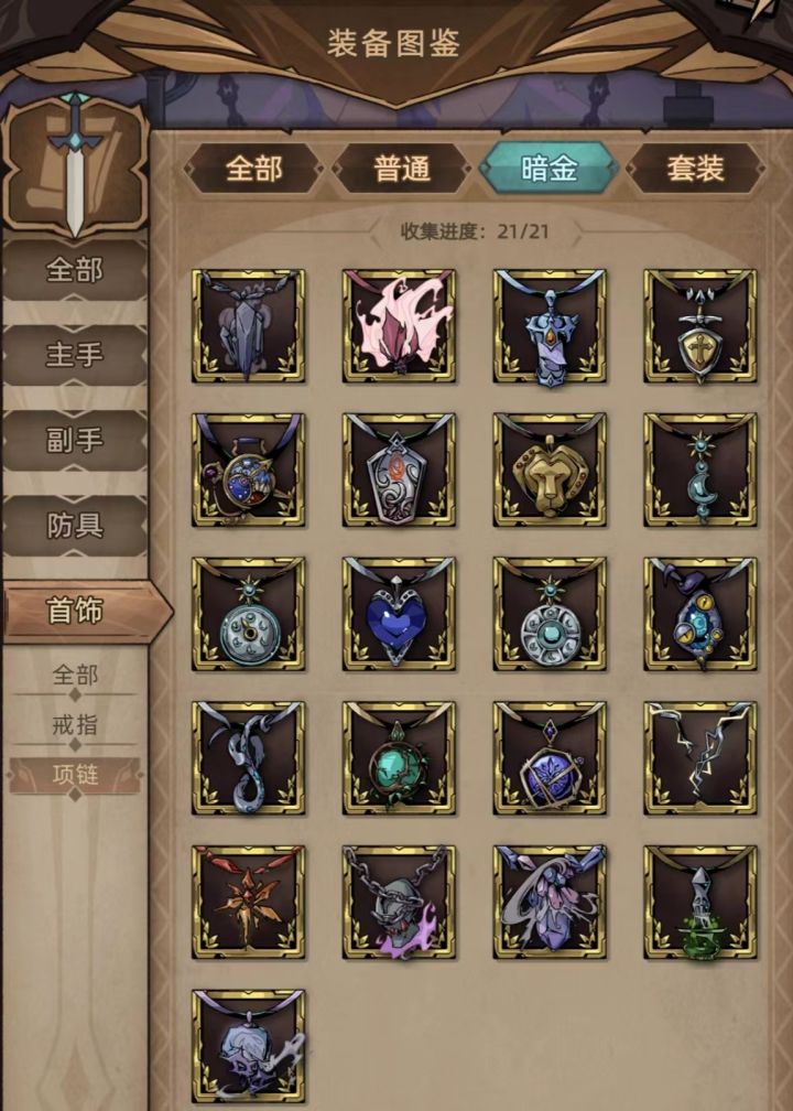 通用装备图鉴-项链 本图鉴按【暗金】→【套装】→【符文之语】的顺序分类。 本系列图鉴中,左下方表示装备词条,右下方表示强化属性 更多图鉴内容,请前往 装备图鉴总目录(一)暗金篇 截止到2023年4月29日,暗金项链共21个。1.深邃狭隙 掉落地点:劫掠者宝箱(击杀磨难难度关卡中乱入的劫掠者,概率掉落该宝箱); 关键词:装备主属性、降低肃正、镶孔、全技能等级提升(概率提升)、自残(概