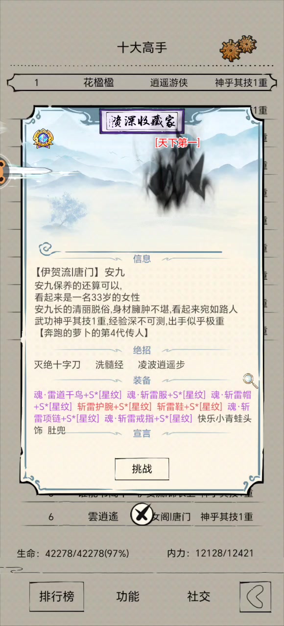 本萌新是240万七破九防,暂时四颗战斗力宝石差一颗破防宝石(破防4+4+0)。对方是暴服比赛天下第一的十字刀(148万真元六破八防五带)经验深不可测的同区人机,装备是五颗战斗力宝石(破防没有满是4+3+3破防),找不到真人,所以只能打打排行榜啦。对面经验是深不可测,导致六脉控制不住对方。人机难度同区深不可测大于跨服经验持平。结论[表情_泪目]十字刀夺天经洗髓克制六脉寒玉,六脉洗髓五五开十字刀组合,