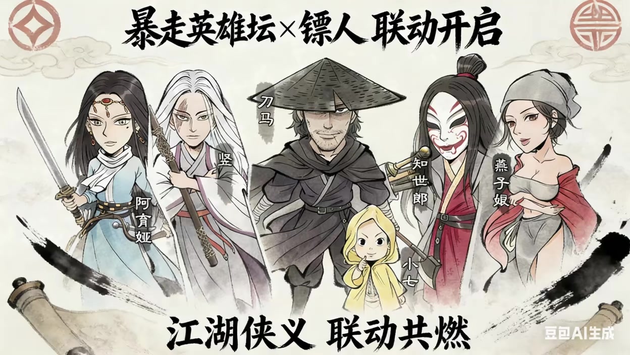 镖行英雄坛·武诀篇 戈壁的风卷着黄沙,一道水墨纹路凭空裂开,飘出平安镇的酒旗。刀马怀里的小七攥紧他的衣襟,好奇地打量着这奇景。 纹路骤然扩大,众人被裹挟至青石板铺就的街巷。街边武馆挂着“雄霸天下刀法”的幌子,衙门墙角还靠着个与小七一模一样的小捕快。 “两个小七?”燕子娘挑眉。竖抚过剑鞘:“我们误入了另一处江湖。” 话音未落,暴走英雄坛的山贼冲了出来,为首头目叫嚣着“太保神拳”。刀马