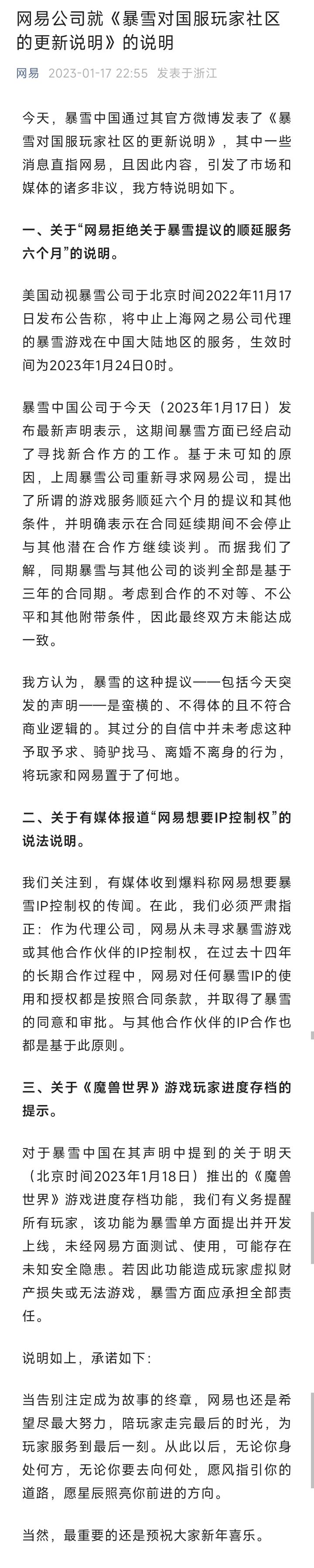 网易回应暴雪:暴雪的“顺延六个月服务”提议离婚不离身,蛮横不得体