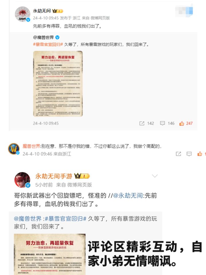什么!特大新闻网易暴雪竟然冰释前嫌复婚了网友评论区的神评论属实给我整乐了网易和暴雪这两公司自23年分手到现在已经过去了快1年多了我估计当时有很多小伙伴和我一样觉得这辈子再也玩不到了国服的炉石和魔兽了而就在最近这件事情竟然发生了反转?!就在4月10日当天暴雪中国微博公告表示暴雪娱乐和网易公司今天宣布再度合作并表示了旗下的游戏将会在今年的夏天陆续重新上线国服!好家伙看到这个消息的时候
