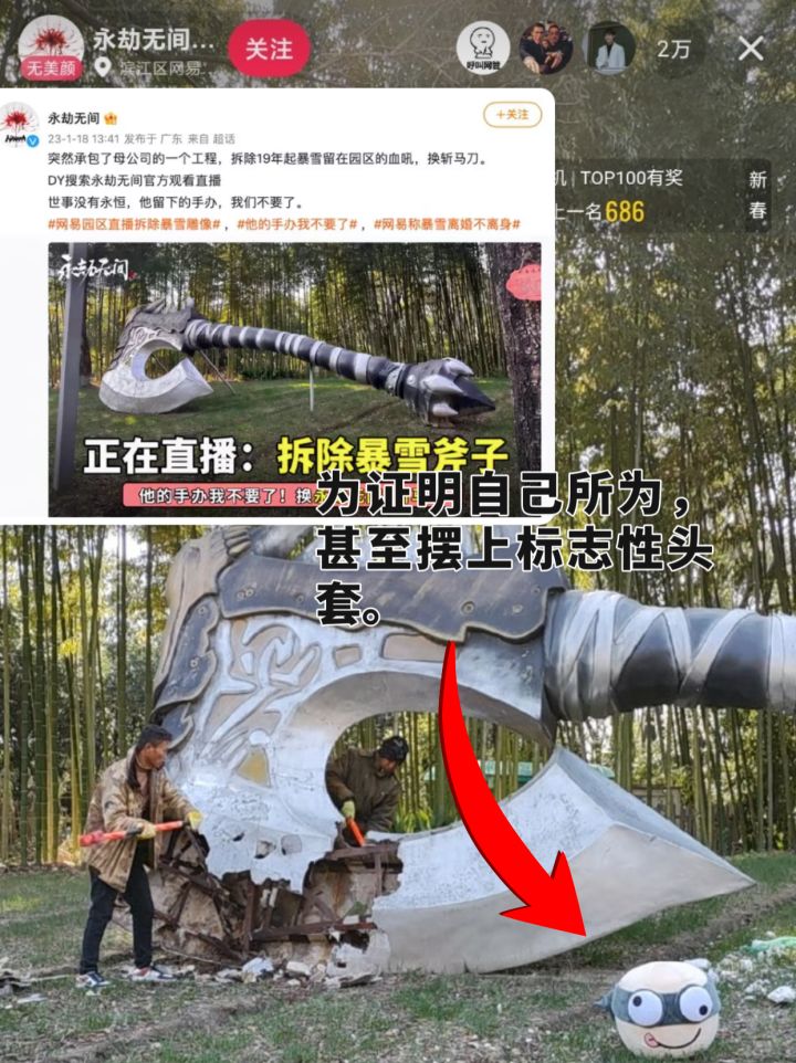 去年暴雪与网易单方面分手,无视广大玩家利益,网络上骂声一片的场景依旧历历在目,但是448天后,今天早上,网易暴雪却高调宣布复婚。对于玩家们而言,这件事既让人高兴,又显得滑稽,对于《永劫无间》而言还有一点小小的尴尬。当时就在分手事件闹得沸沸扬扬之际,出于为玩家们与自家老大(网易)出气的目的,永劫官方发起了一场让人意想不到的直播——拆除园区魔兽世界血吼雕像,并扬言要摆上自家斩马刀,迎来无数围观,狠狠