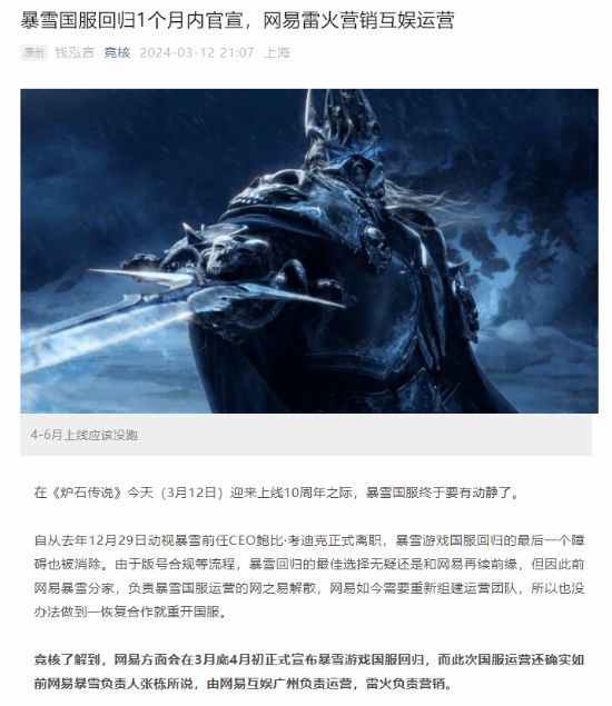 据国内媒体“竞核”3月12日晚发文爆料称,暴雪国服3月底至4月初期间将官宣回归,而此次国服运营还确实如前网易暴雪负责人张栋所说,由网易互娱广州负责运营,雷火负责营销。但目前网易官方暂未明确相关信息,或许在接下来的一个月内,玩家们应该就能够自己“一探究竟”了。#今天游戏圈发生了啥#游戏资讯#吃瓜爆料#暴雪和网易