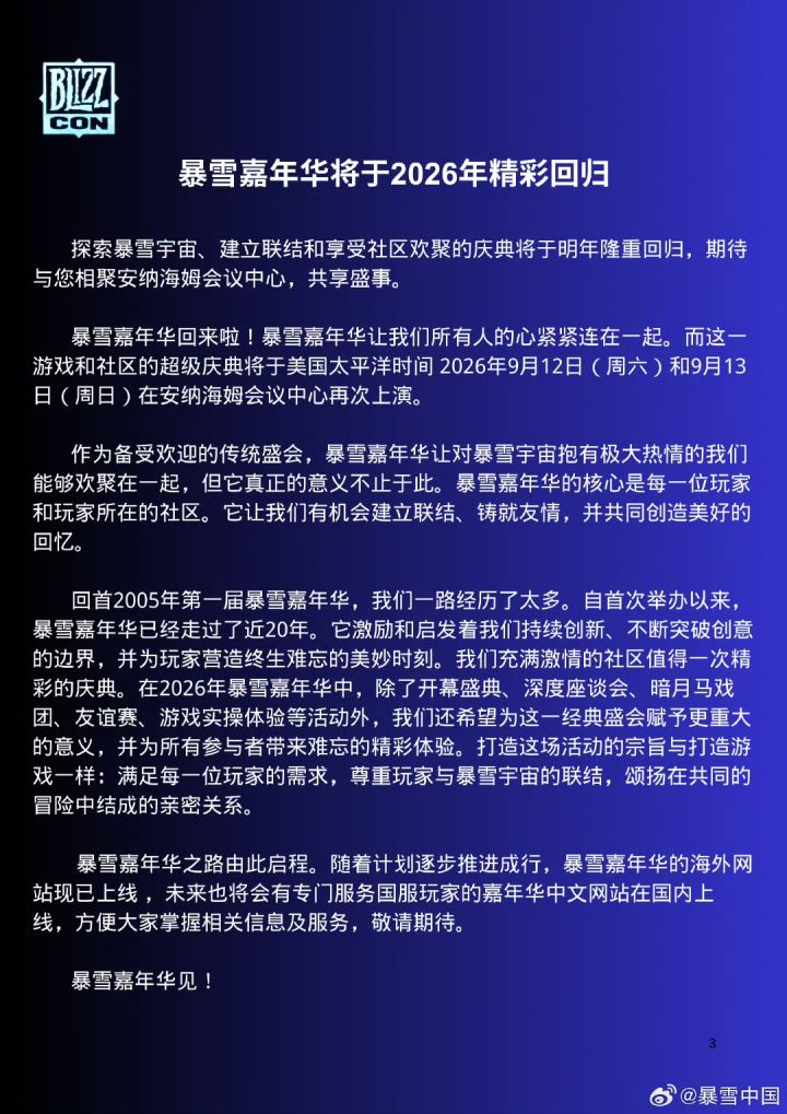 暴雪官方宣布,暴雪嘉年华将于2026年9月12日至13日回归,举办地点为美国加利福尼亚州阿纳海姆会议中心。此外还计划为国服玩家推出专门的嘉年华中文网站。门票发售具体信息将在后续逐步公开。#游戏杂谈 #今天游戏圈发生了啥 #暴雪 #暴雪嘉年华