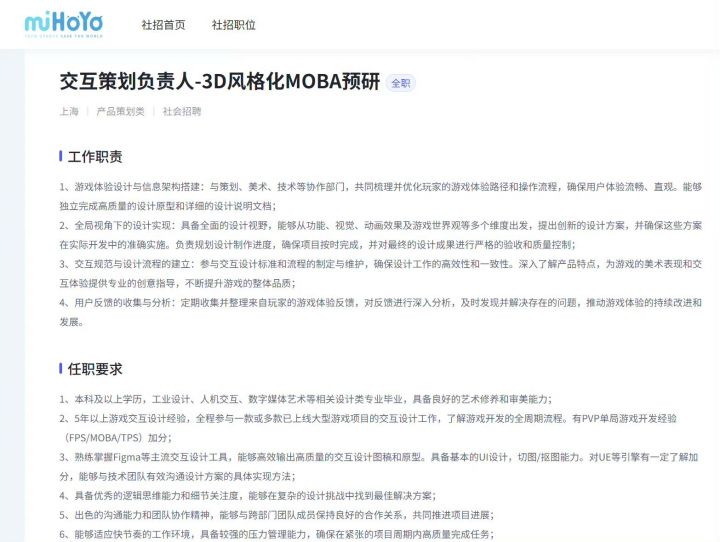 有资格挑战这个品类的厂商不多了。文/九莲宝灯米哈游也想做MOBA了。近期,米哈游官网上的一则招聘,引起了不少从业者的讨论。从招聘信息可得知,米哈游正在预研一款PC/主机端的、使用UE5引擎的3D MOBA游戏,且美术将会相对偏欧美风格化。看到这则信息,不少人开始了想象。有人认为,这再次说明了米哈游近年来想要「走出二次元舒适圈」的决心,也有人认为,内容见长的米哈游,或许会制作一款将自身内容能