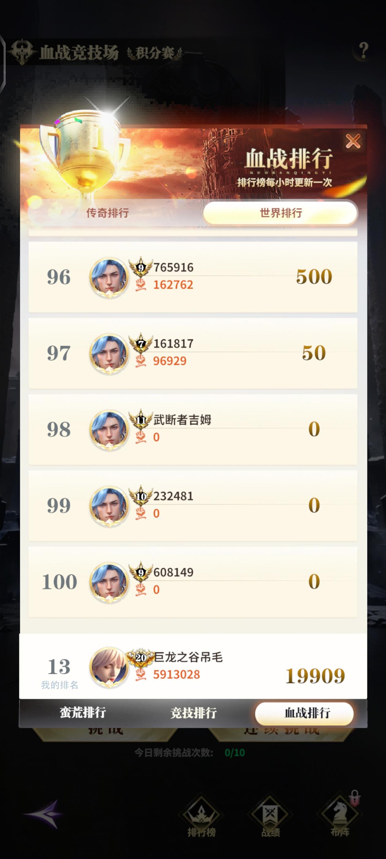 今天周四了,无聊看了下血战最后排名的分数,#最后的勇者 发现最后几个是没打的,忽然就感觉冷清了许多。