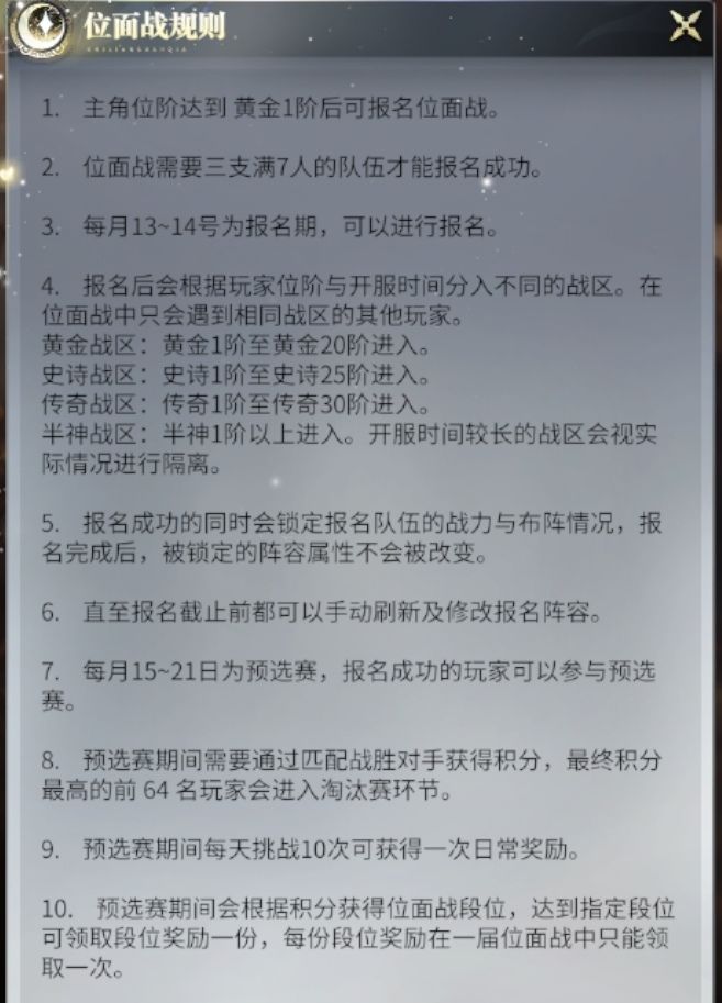 一,游戏规则:1,总结流程就是:报名→预选赛→淘汰赛。2,具体参考下面截图:二,拆解游戏规则,细说注意事项。1,【报名期】:每月的13、14日报名,两天时间。注意了,如果错过了报名,或者不报名,是不能够参加【预选赛】、【淘汰赛】的。只能参加【淘汰赛】时的竞猜,等同【血战】的竞猜。2,【预选赛】:报名后,才能参加。游戏规则是:3个队伍 VS 3个队伍三盘两胜不管输赢,都要打满三盘